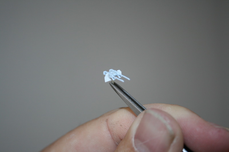 Die Kanonen wurden durch Kanülen ersetzt, die mit einem Feuerzeug durch ausglühen schwarz angelassen wurden. Die Fahrwerksklappen waren zusammen gegossen, weshalb ich den unteren Abschnitt abgesägt und mit Sheetmaterial ersetzt habe.