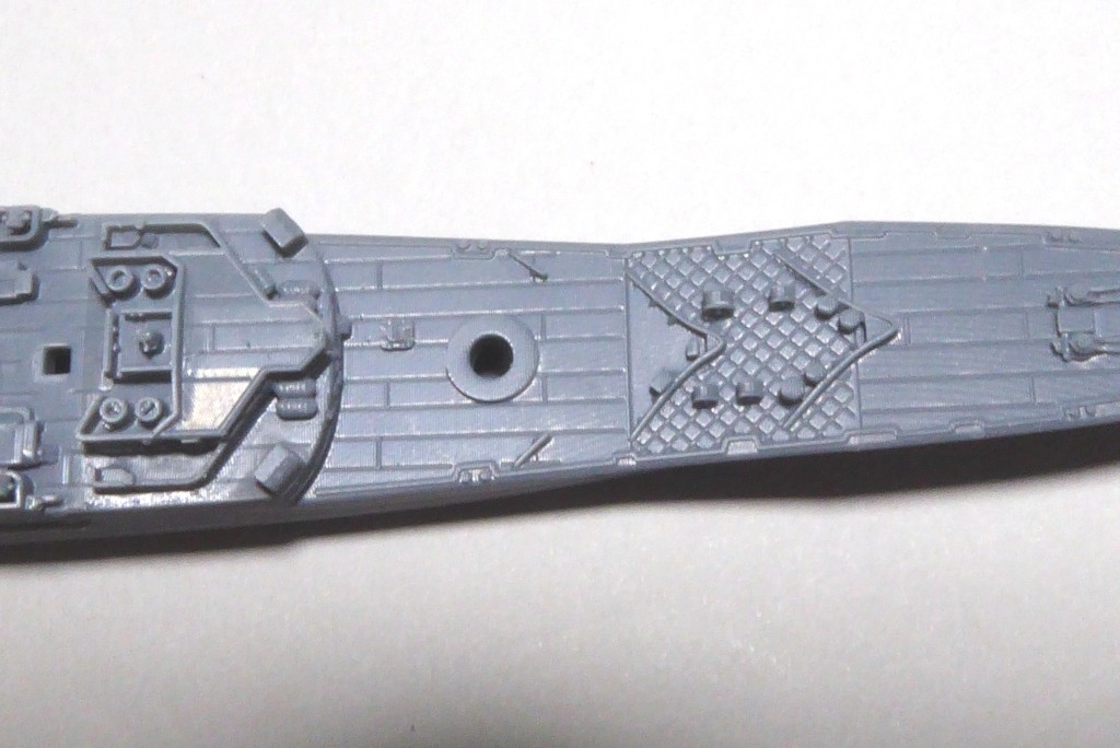 Alle Teile sind sauber, aber nicht gerade scharfkantig gedruckt und gut detailliert. Leider wurde bei der Detaillierung aber des Guten zuviel getan. Rumpf und Decks sind nämlich mit einem kräftig gravierten kachelartigen Muster überzogen, das ausgesprochen störend wirkt.