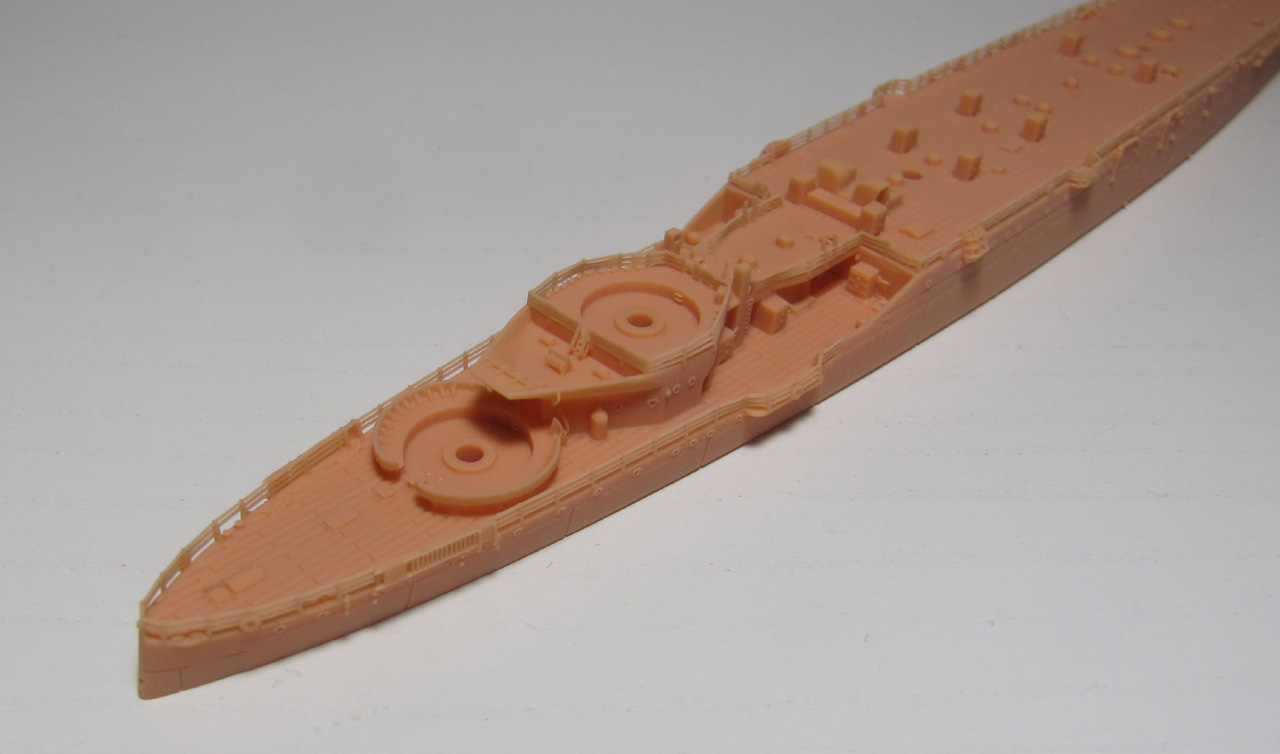 Der Rumpf ist hier nur bis zum Backdeck gedruckt. Der Rumpf ist von den Abmessungen und der Form vorbildgetreu. Die Detaillierung ist aber teilweise etwas grob, so sind die Gravuren für die Decksplanken relativ stark und die Gravuren an den Rumpfseiten sind stark übertrieben - bei Original wirken die Rumpfseiten glatt. Eine Reling ist angedruckt, aber relativ dick. Sehr merkwürdig ist ein massives, rundes Loch unterhalb des Ankers auf der Backbordseite (ist auf den Fotos nicht zu sehen, da es mir erst nach dem Fotografieren aufgefallen ist). Dieses Loch sieht man auch auf den Werbefotos auf eBay, auch etwas auf dem Titelbild ganz oben. Mir ist schleierhaft, was einen solchen Fehler in den Dateien verursachen kann. Man wird es verfüllen/verspachteln müssen, ohne den Anker und die Bullaugen in der Nähe zu beschädigen Bei meinem Exemplar beginnt sich der Rumpf etwas zu verbiegen (Bug und Heck nach unten). Es gibt unten im Rumpf eine Vertiefung, in die man ein Metallteil zu Stabilisierung des Rumpfs einkleben kann.