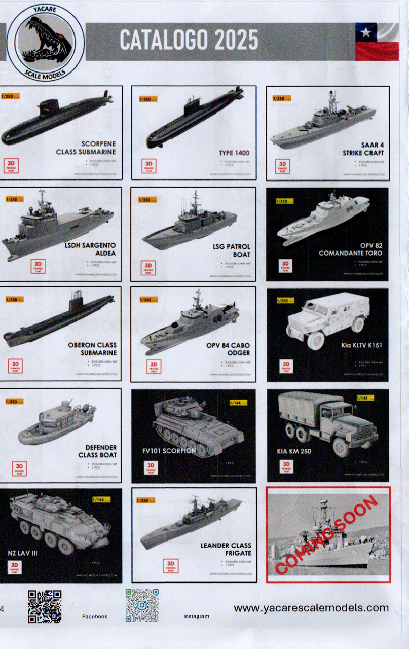 Yacare Scale Models ist ein chilenischer Anbieter von Resinbausätzen, die 3D-gedruckt werden. Der Hersteller bietet Schiffe, U-Boote, Flugzeuge, Hubschrauber und Fahrzeuge an, sowohl auf einer eigenen Seite als auch auf eBay (bisherige Erfahrung: die Preise für die Bausätze auf der eigenen Seite des Herstellers sind geringer, aber sind sie auch nicht versteuert, so dass beim Import entsprechende Gebühren hinzu kommen. Der Versand auf eBay ist billiger, hier kommen auch keine zusätzlichen Gebühren hinzu, da die Artikel bereits versteuert sind. Der Versand über die eigene Seite des Herstellers erfolgte über UPS, deren Gebühren für die Bearbeitung der Verzollung höher als bei DHL sind). Die meisten Bausätze stellen Ausrüstung des chilenischen Marine, Luftwaffe und Armee da, es gibt aber auch einige andere Bausätze, u.a. von britischen, türkischen und US-amerikanischen Schiffen. Außerdem waren einige der chilenischen Schiffe früher in Diensten anderer Marinen, z.B. der französischen und niederländischen.
