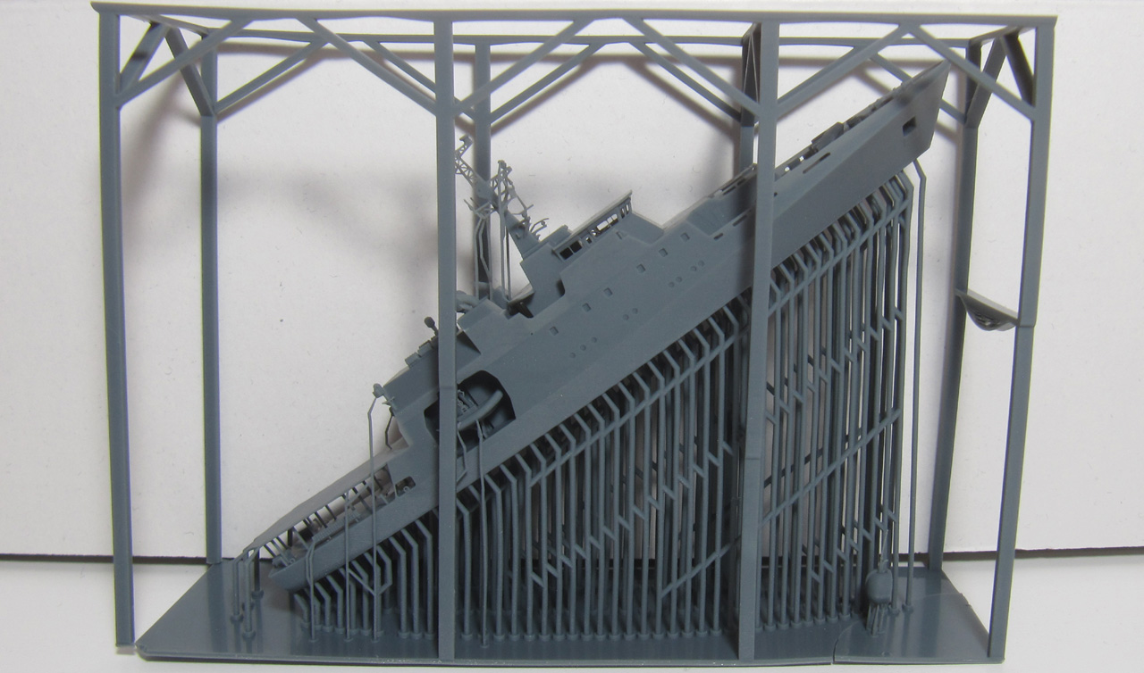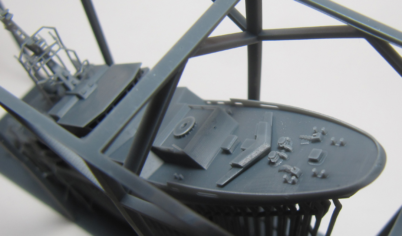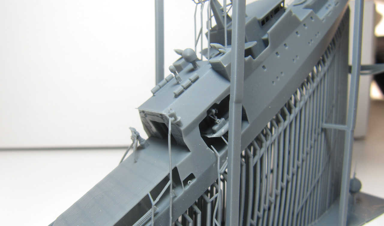 Der Rumpf ist komplett mit Aufbauten und Mast als ein Teil gedruckt. Der Druck ist von sehr hoher Qualität. Die Brückenfenster sind offen dargestellt, genauso der Hangar. Auch der Bereich unter dem Hubschrauberdeck ist gut detailliert, genauso die beiden Beibootbuchten. Auch der Mast ist sehr gelungen. Bei meinem Exemplar gibt es nur bei dem Beiboot auf der Steuerbordseite ein Problem: hier ist der hintere Teil der Schwimmer nicht richtig ausgeformt.