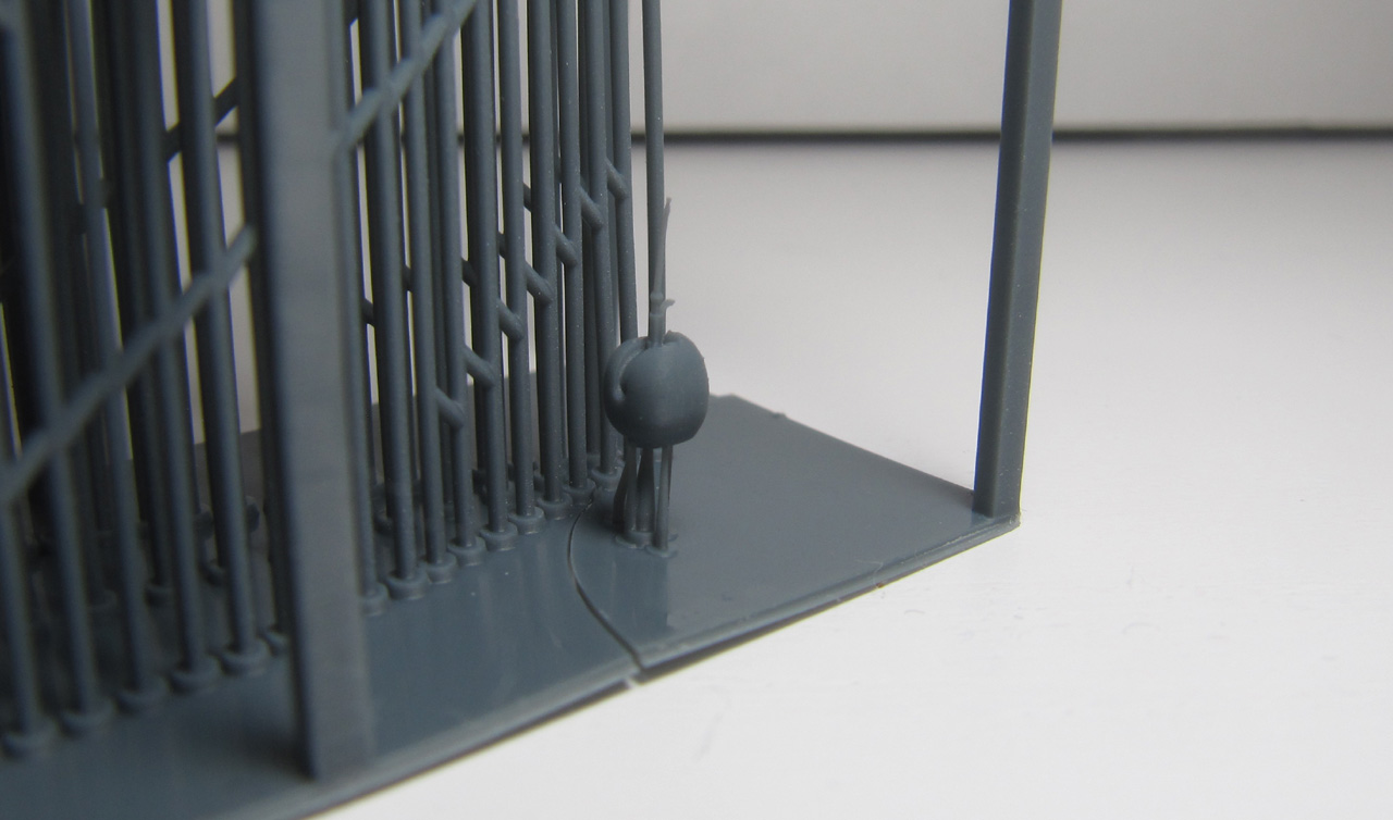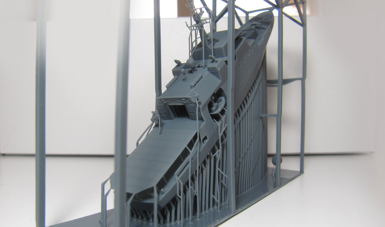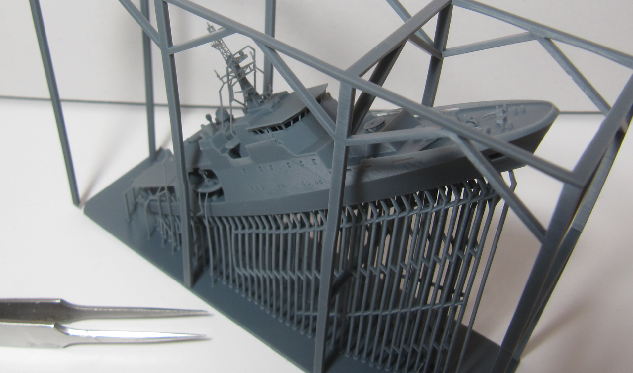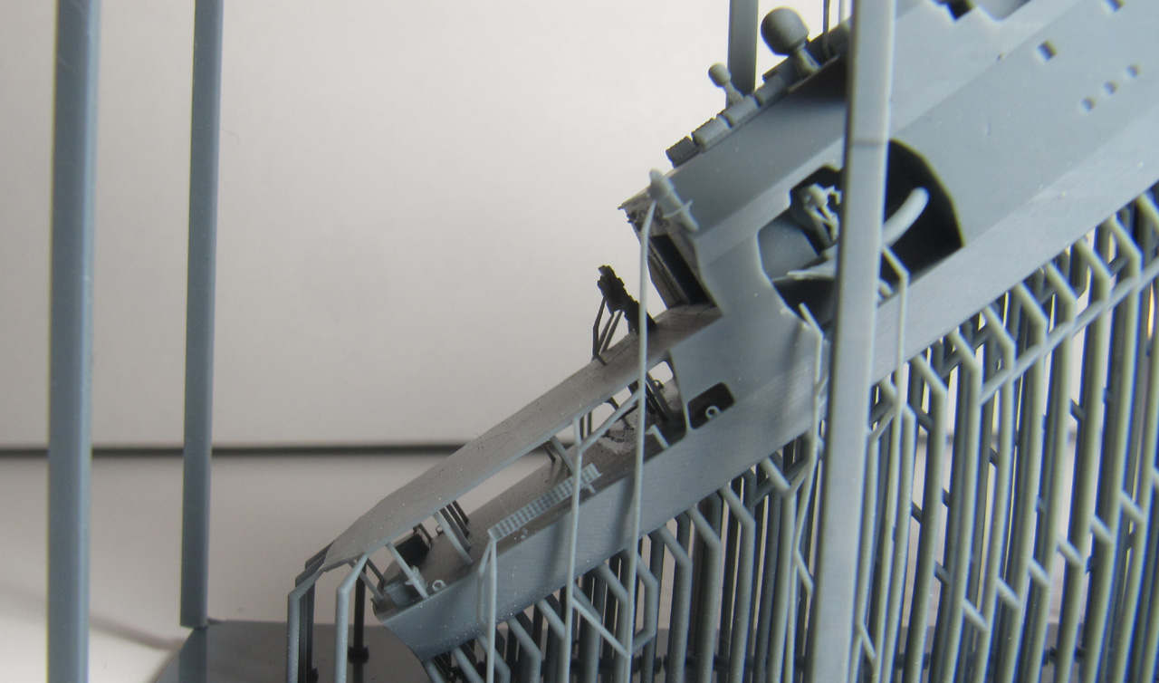 Der Rumpf ist komplett mit Aufbauten und Mast als ein Teil gedruckt. Der Druck ist von sehr hoher Qualität. Die Brückenfenster sind offen dargestellt, genauso der Hangar. Auch der Bereich unter dem Hubschrauberdeck ist gut detailliert, genauso die beiden Beibootbuchten. Auch der Mast ist sehr gelungen. Bei meinem Exemplar gibt es nur bei dem Beiboot auf der Steuerbordseite ein Problem: hier ist der hintere Teil der Schwimmer nicht richtig ausgeformt.