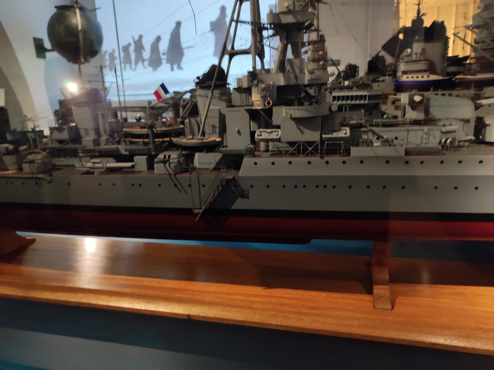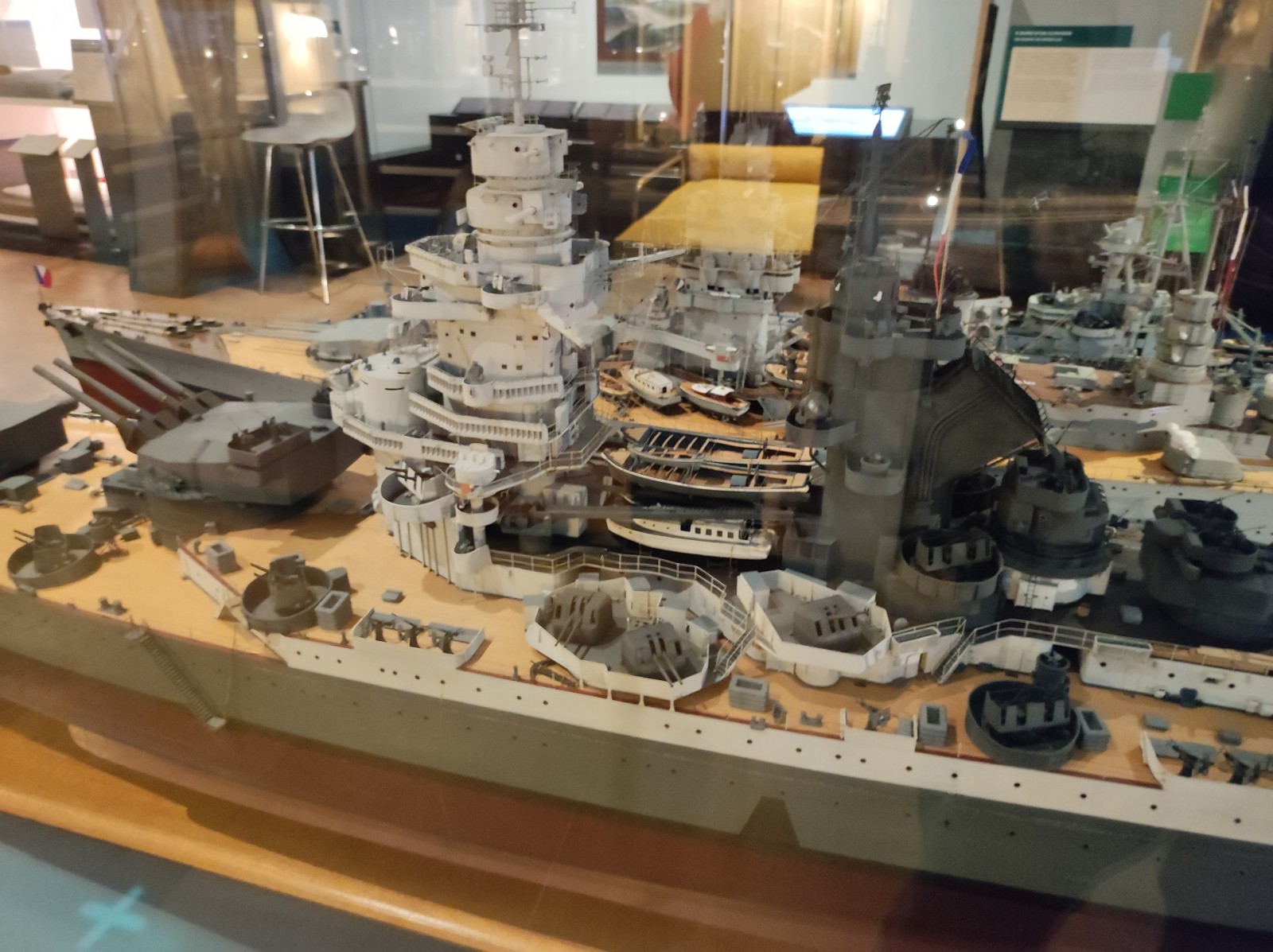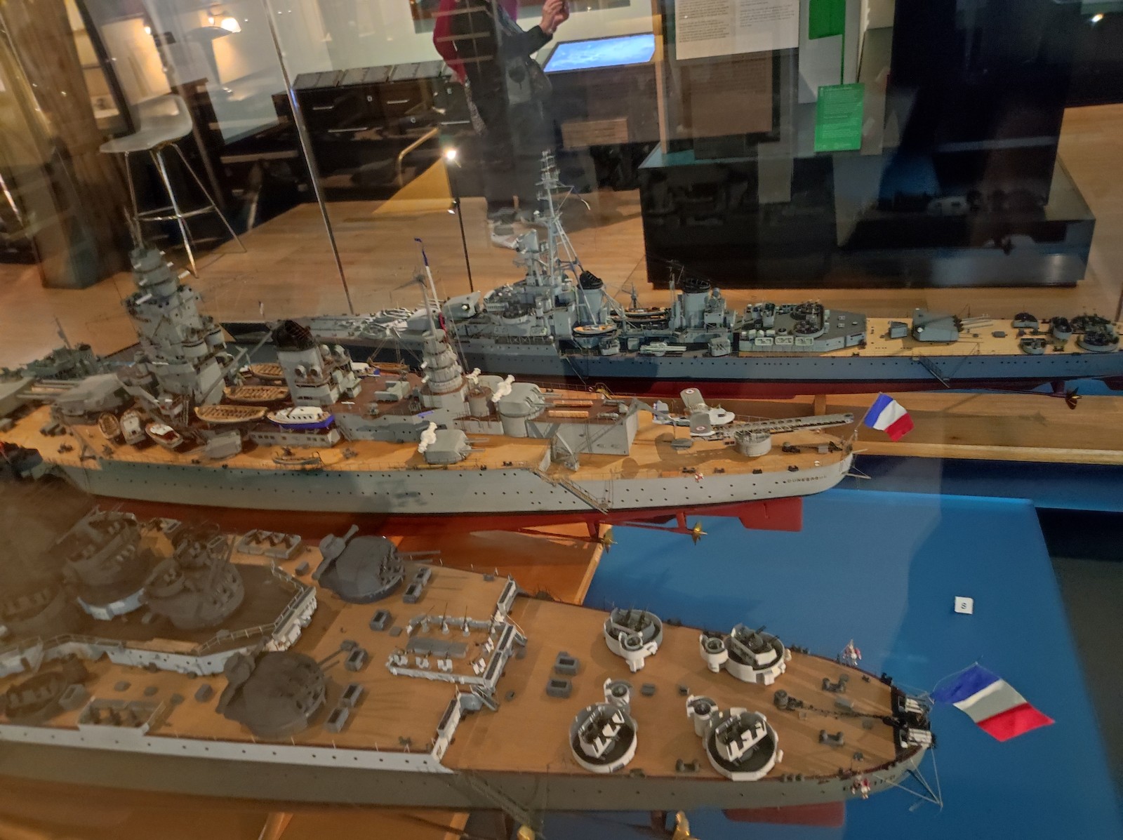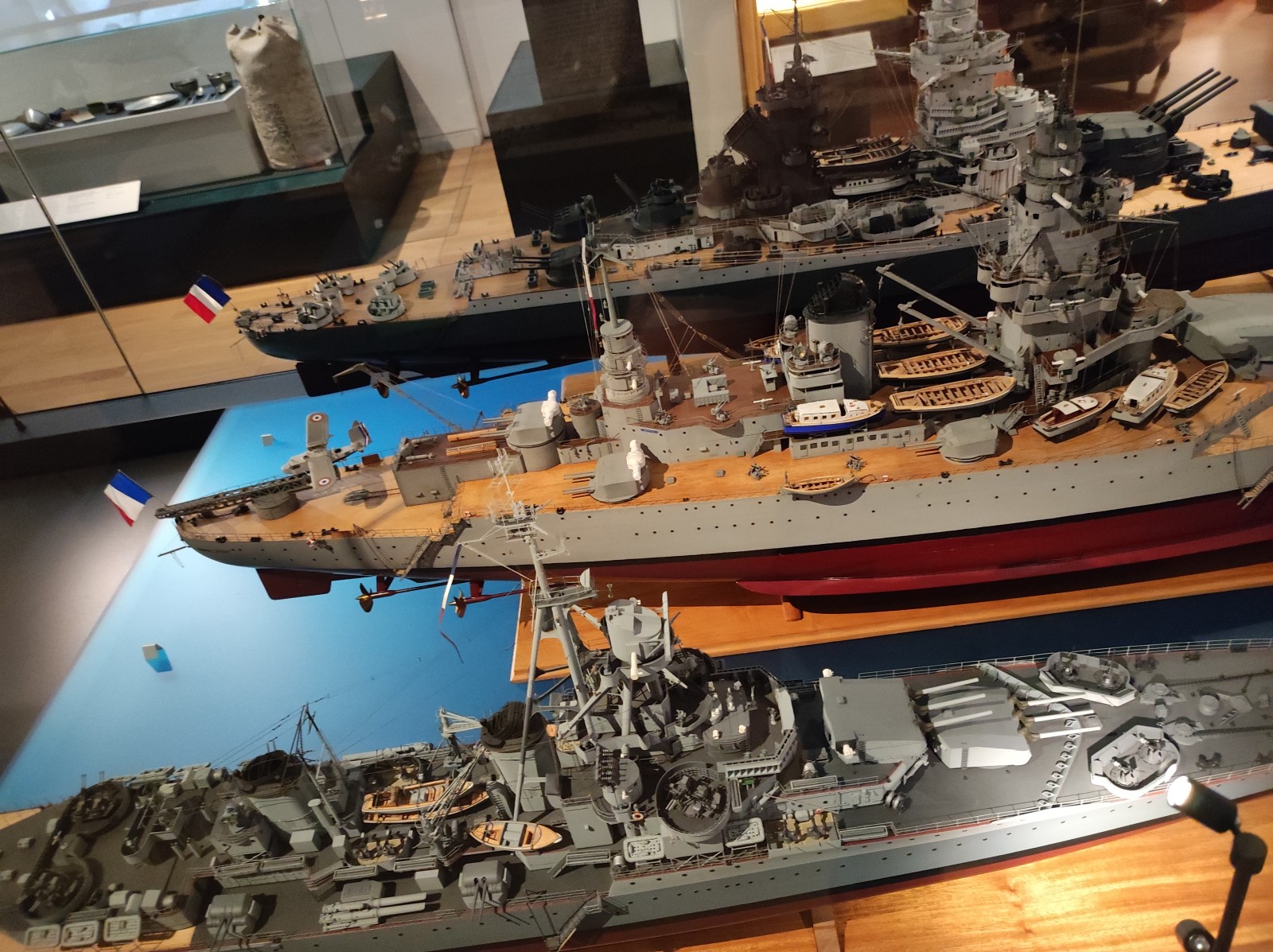 Weiter geht es mit Modellen im Musée national de la Marine de Paris aus der Zeit des Zweiten Weltkriegs, darunter der Flugzeugträger Béarn, der Leichter Kreuzer Georges Leygues, die Korvette Aconit sowie die Schlachtschiffe Lorraine, Dunkerque und Richelieu.
