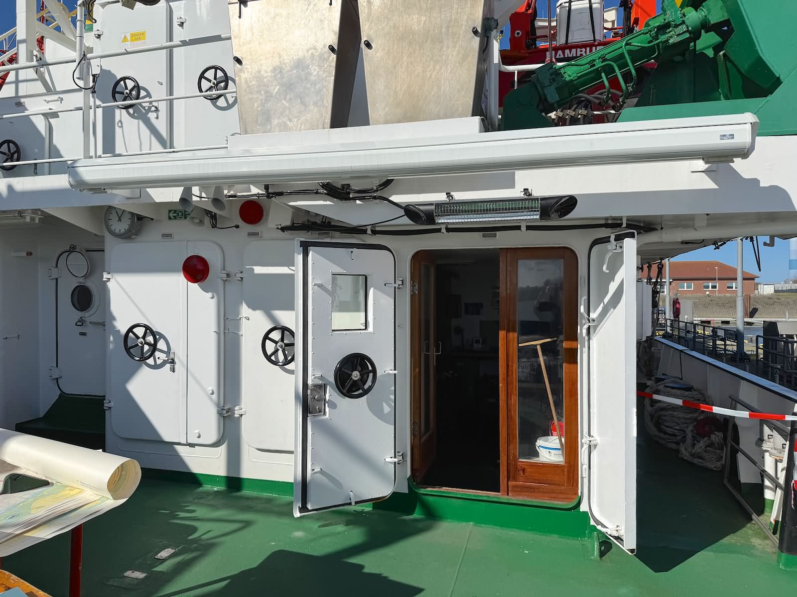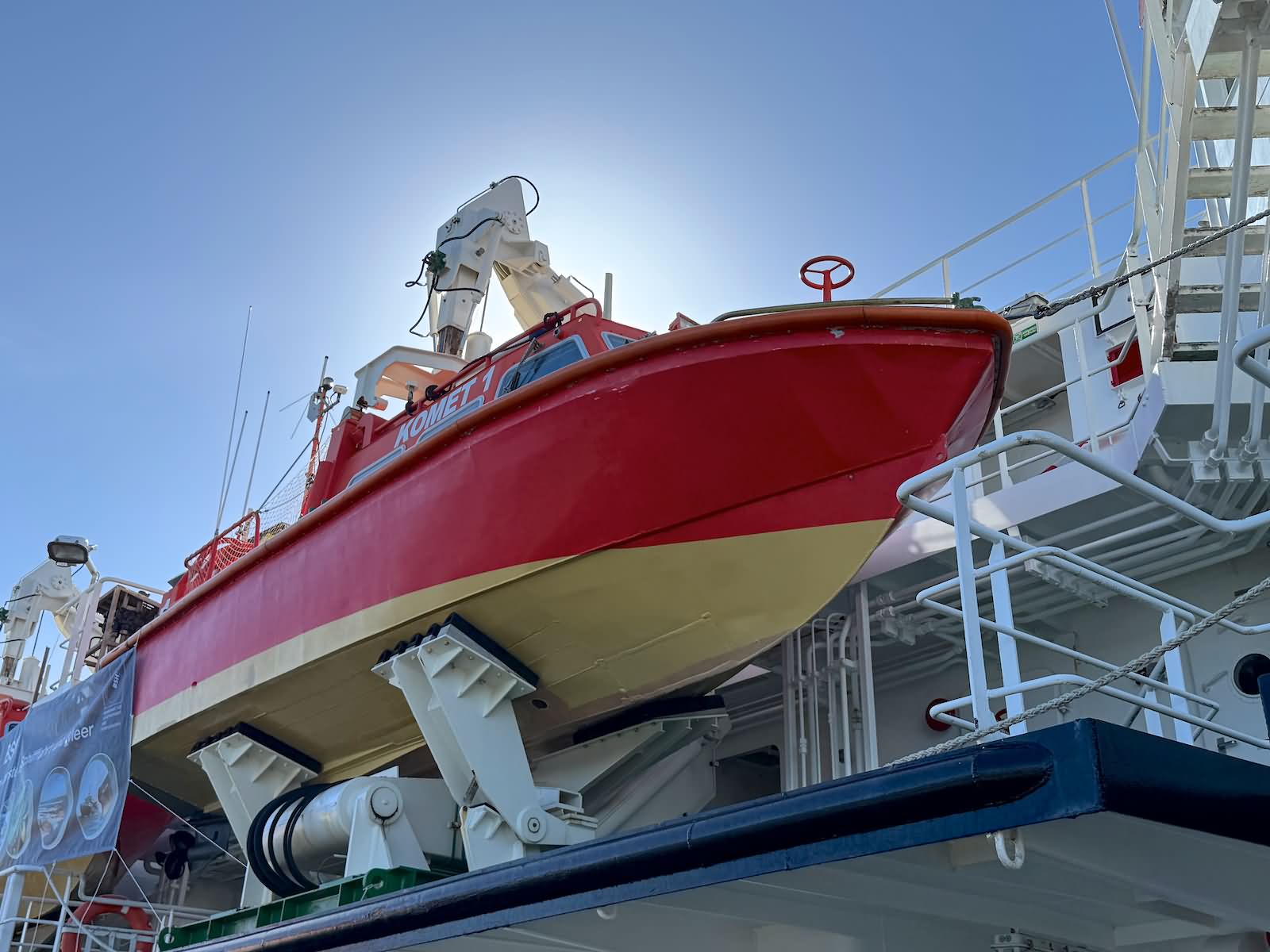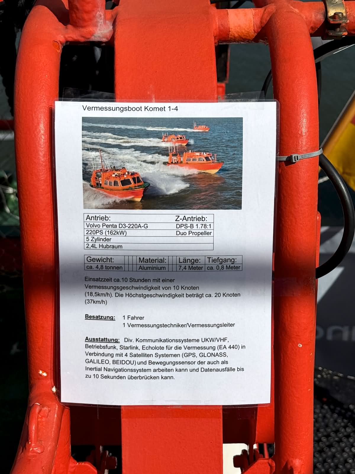 Der Rundgang beginnt mit einer Außenansicht des Schiffes, bei der die Vermessungsboote gut zu erkennen sind: jeweils zwei an Steuerbord und Backbord sowie ein Schlauchboot an der achteren Position auf der Backbordseite. Anschließend führt der Weg zum Achterschiff, wo sich die Mehrzweckkräne in schwerer und leichter Ausführung befinden, ebenso eine Mehrzweckwinsch, eine Luke zum Maschinenraum für die Dieselaggregate sowie die Anlage zur Müllkompression. Von dort geht es entlang des Gangs auf der Backbordseite weiter in den Innenbereich zur Werkstatt. Im Maschinenraum sind einer der drei Dieselgeneratoren zur Stromversorgung, verschiedene Pumpen und Kompressoren sowie der elektrische Fahrmotor zu sehen. Direkt anschließend befindet sich der Maschinenfahrstand. Weiter führt der Rundgang in die Messe, die mit den Bordwappen der Vermessungsschiffe geschmückt ist. Danach gelangt man auf das Oberdeck an Steuerbord, wo sich ein weiteres Vermessungsboot sowie der Steuerbordgang befinden. Im Vorschiff sind eine Luke zur Schottel-Anlage sowie eine Winsch untergebracht. Auf der Brücke befinden sich der Fahrstand und die Steuerung der Schottel-Anlage. Die Komet ist mit einem Schottel-Pumpjet im Vorschiff ausgestattet. Zudem ist der Rumpf so konstruiert, dass das Schiff trockenfallen kann. Im weiteren Verlauf werden Details der Vermessungsboote gezeigt, darunter Antennen, Kräne und weitere Ausrüstung. Auch das Schlauchboot auf der achteren Backbordseite wird näher betrachtet; es wird durch einen Waterjet angetrieben. Abschließend folgen Außenaufnahmen der Backbordseite. Ein Bild ist zwar unscharf, aber dennoch aufschlussreich: Auf Höhe der Brücke an Steuerbord befindet sich ein ausklappbarer Galgen, mit dem eine Unterwasserschallsonde ausgebracht werden kann. Diese wird bis zum Meeresboden abgelassen, um anhand der Laufzeiten durch unterschiedliche Dichteschichten eine Kalibrierung vorzunehmen, was letztlich die Genauigkeit der Messergebnisse verbessert.