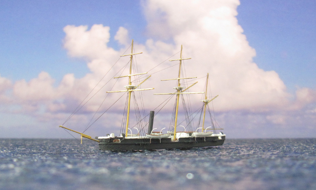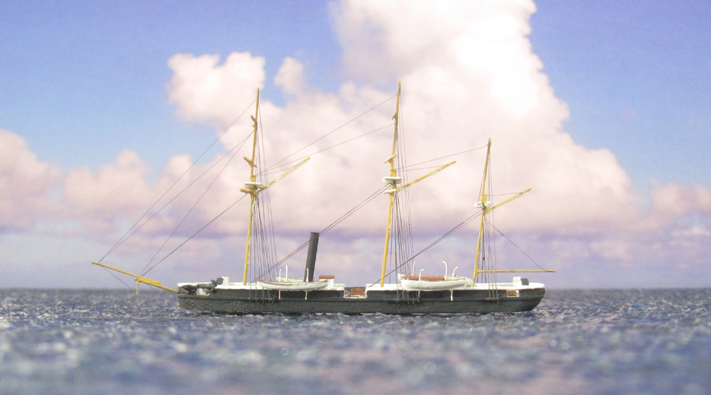 Das Modell des norddeutschen Kanonenboots SMS Meteor baute ich auf der Basis eines 3D-gedruckten Modells von Brown Water Navy Miniatures, das noch bei Shapeways in der Smooth Fine Detail Plastic-Qualität gedruckt worden war (siehe Bausatzbesprechung). Den Schornstein ersetzte ich durch einen längeren aus einem Messingrohr. Die Masten sind aus Metallteilen gebaut, die Marsen aus Plastikteilen. Die vorhandenen Beiboote und Davits ersetzte ich - die Beiboote durch Teile von PetrOs Modellbau, ModellbauRay, und Brown Water Navy Miniatures (neuere Entwürfe) sowie die Davits durch 0,15-mm-Kupferdraht. Für die Takelung benutzte ich elastischen schwarzen 40 Denier-Faden (0,068 mm) von Infini Model sowie schwarzen 20 Denier-Faden (0,05 mm) von UNI Caenis, der mit einem Heißwachsspachtelgeräte nachgespannt wurde. Bei eingeholten Segel sind mit Weißleim angedeutet.