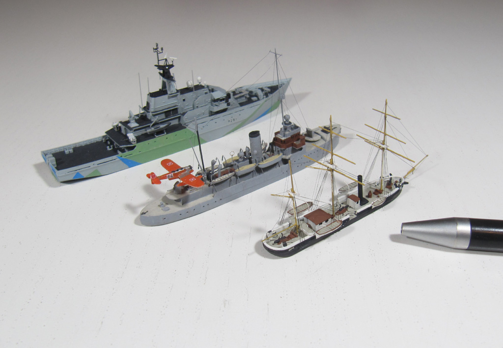 Die Meteor war ein sehr sehr kleines Schiff, deshalb interessant, dass ein typischer Kreuzer aus der ersten Hälfte des 18. Jahrhundert, das britische 24-Kanonenschiff HMS Rose (1740), noch kürzer war (linkes Foto). Rechts die Meteor mit zwei Kreuzern aus dem 19. Jahrhundert: der dänischen Hekla (1842) und der chinesischen Fupo (1871).