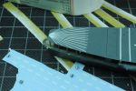 Auf einer Modellbauausstellung hatte ich mir den Bausatz für nur 14 € gekauft. Ein Schnäppchen gegenüber dem Ladenpreis oder, besser gesagt, dem Internetpreis. Längere Zeit schlummerte der Bausatz im Modellbaulager, bis ich mich entschloss, ein Zwischendurch-Projekt zu starten. Im einteiligen Rumpf wurden zuerst die Bullaugen aufgebohrt. Sowohl die Wasserlinienplatte als auch das Hauptdeck passen problemlos von unten bzw. von oben an den Rumpf, hier ist keine Nacharbeit notwendig. Ab diesem Zeitpunkt wurden unzählige kleine Teile auf dem Hauptdeck platziert. Schlecht umgesetzt ist die Montage der 16 Stützen, die das Flugdeck am Bug abstützen. Zwar besitzen die Stützen verschiedene Teilenummern, sind aber letztendlich alle gleich lang. Weiterhin sollen diese 16 Stützen von unten an das Flugdeck, und anschließend dieses von oben auf das Deck geklebt werden. Entgegen der Bauanleitung wurden alle Stützen sowie Bootsdavits auf das Hauptdeck geklebt. Damit konnte das Flugdeck gesondert lackiert werden. Zuerst wurden die mit Holz belegten Bereich mit Beige und anschließend das Stahldeck mit Grau lackiert. Vor dem Anbringen der Decals wurde alles mit einer Schicht Future versiegelt. Damit begannen meine Probleme. Trotz Einsatz von Mr. Mark Setter und Mr. Mark Softer hielten die Decals nicht und silberten enorm, ganz besonders im Bereich des „Fächers“ am Bug. Beim Ausbessern einiger Stellen verwendete ich zwar gebrauchtes Tamiya Tape zum Abkleben, aber beim Demaskieren zog ich Teile der Decals, wie z.B. die Doppelringe, wieder ab. Da ich diese nicht ersetzen konnte, wurden die Reste schweren Herzens wieder vollständig entfernt. Wie schon anfangs erwähnt, sind die Tragflächenverstrebungen bei den vier Doppeldeckern zu massiv. Hier verwendete ich fotogeätzte Verstrebungen der Swordfish von FlyHawk. Lackiert wurde die grauen Bereiche der Hosho in IJN02 Kure Gray von White Ensign Models (heute Sovereign Hobbies).