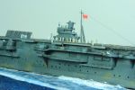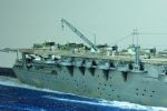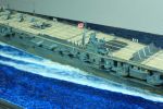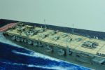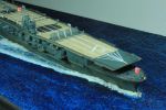Im einteiligen Rumpf wurden zu Beginn alle Bullaugen mit einem 0,3 mm dicken Bohrer aufgebohrt, um damit eine größere Tiefenwirkung zu erreichen. Anschließend konnte die Wasserlinienplatte eingeklebt, verspachtelt und leicht verschliffen werden. Auf die beiden Metallplatten verzichtete ich. Stattdessen bohrte ich ein Loch in die Bodenplatten und klebte eine Mutter auf deren Oberseite ein. Damit verschraubte ich später das Modell mit dem Wasserdisplay. Es folgte die Montage der Decks an Bug und Deck. Die Montage der Waffenplattformen, der Schornsteine und der sogenannten Schwalbennester ging flott vonstatten. Im Anschluss daran klebte ich die Reling an die Deckkanten des Rumpfes und einige seefeste Türen an die Wände in Bereich der Waffenplattformen. Es folgte eine Lackierung in IJN02 Kure Gray von WEM. Die Unterseite des Flugdecks und die Insel wurden ebenfalls lackiert. Die Bewaffnung wurde zu diesem Zeitpunkt noch nicht angebracht da diese teilweise ausgetauscht, separat lackiert und erst später angebracht werden sollte.