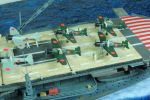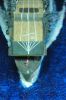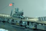 Das Holzdeck ist angenehm dünn und schön gelasert. Es weist feine Struktur auf und die einzelnen Deckplanken sind maßstabsgerecht wiedergegeben. Allerdings decken sich die drei Öffnungen der Aufzüge nicht mit denen des Holzdecks. Die größte Abweichung war am vorderen Aufzug. Dort wurde mittels eines Skalpells und Metalllineal durchtrennt und ein ca. 1 mm breiter Streifen abgeschnitten. Nun konnte die Klebefolie nach und nach abgezogen und auf die beiden Stücke auf das Plastikdeck geklebt werden. Die Haftung ist sehr gut, deshalb sollte dies beim ersten Versuch gelingen. Um die zusätzliche Höhe des Holzdecks auszugleichen, liegen für die drei Aufzüge fotogeätzte Teile bei. Am Bug und Heck gibt es ebenfalls Fotoätzteileile, die beim Original in Stahl gehalten sind. Diese fünf Teile wurden vorlackiert und auf die jeweilige Position geklebt. Zu diesem Zeitpunkt fiel auf, dass das Holzdeck bis an die Kante des Flugdecks reicht. Dies ist unschön, weil es für entlang der Kante fotogeätzte Laufwege gibt, die jetzt auf das hölzerne Flugdeck geklebt werden mussten und damit leicht auftragen.