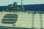 Die weißen Flugdeckmarkierungen und der rotweiße Bereich am Heck wurden mit Airbrush lackiert. Nur für den Windrichtungsanzeiger am Bug wurde das Abziehbild des Bausatzes verwendet. Da mir der Holzfarbton zu hell war, benutzte ich einen weichen Bleistift, setzte diesen flach an und trug solange Graphit auf, bis ich mit dem Farbton zufrieden war.