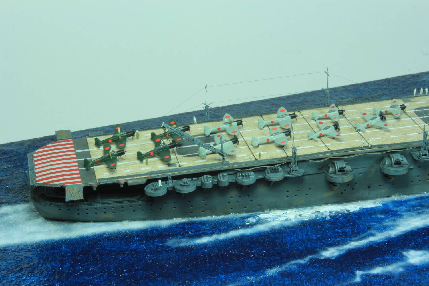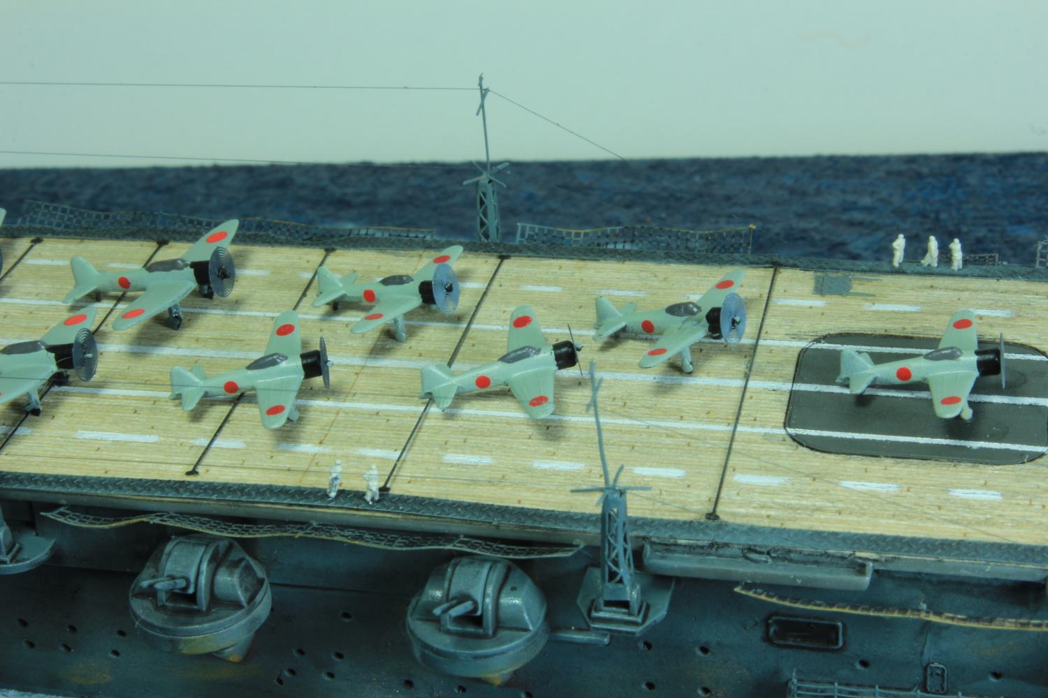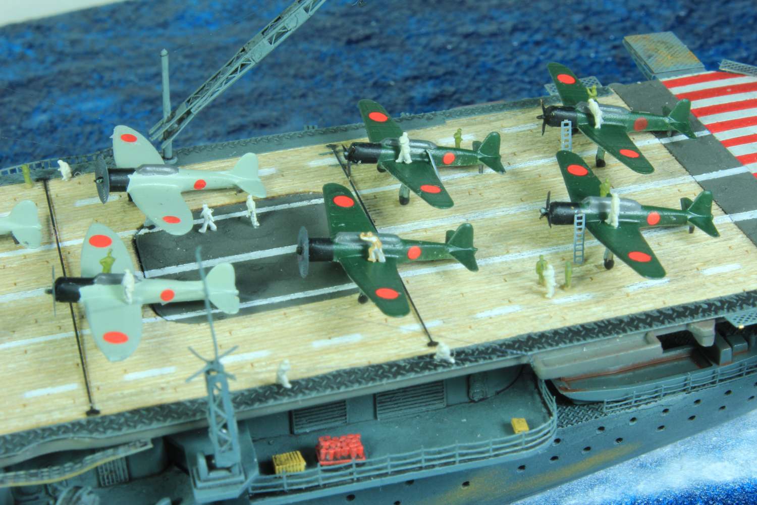 Die dem Bausatz beiliegenden A6M2 Zero (Zeke) und D3A Type 99 (Val) wurden mit Tamiya JN Gray, die B5 Type 97 (Kate) dagegen mit Tamiya JN Green mit Airbrush lackiert. Die schwarzen Motorhauben und die dunkelgrauen Cockpithauben hingegen wurden gepinselt. Nach einer Schicht Klarlack kamen die Abziehbilder drauf, die abschließend mit Mattlack versiegelt wurden. Final kamen stehende und rotierende Propeller an die Flugzeuge.