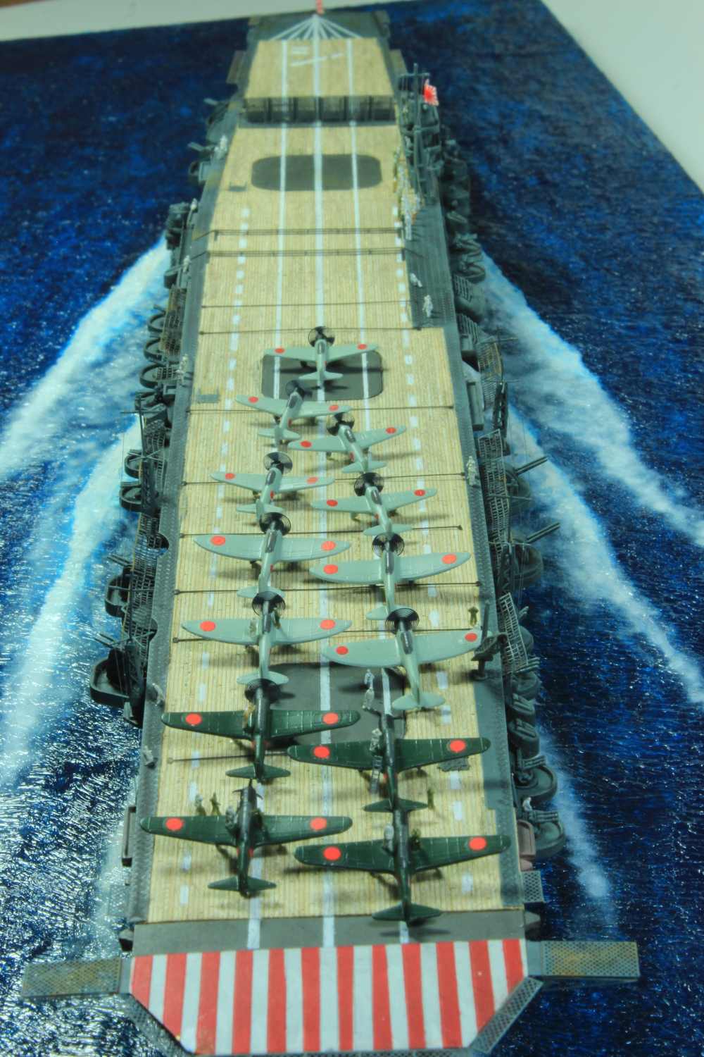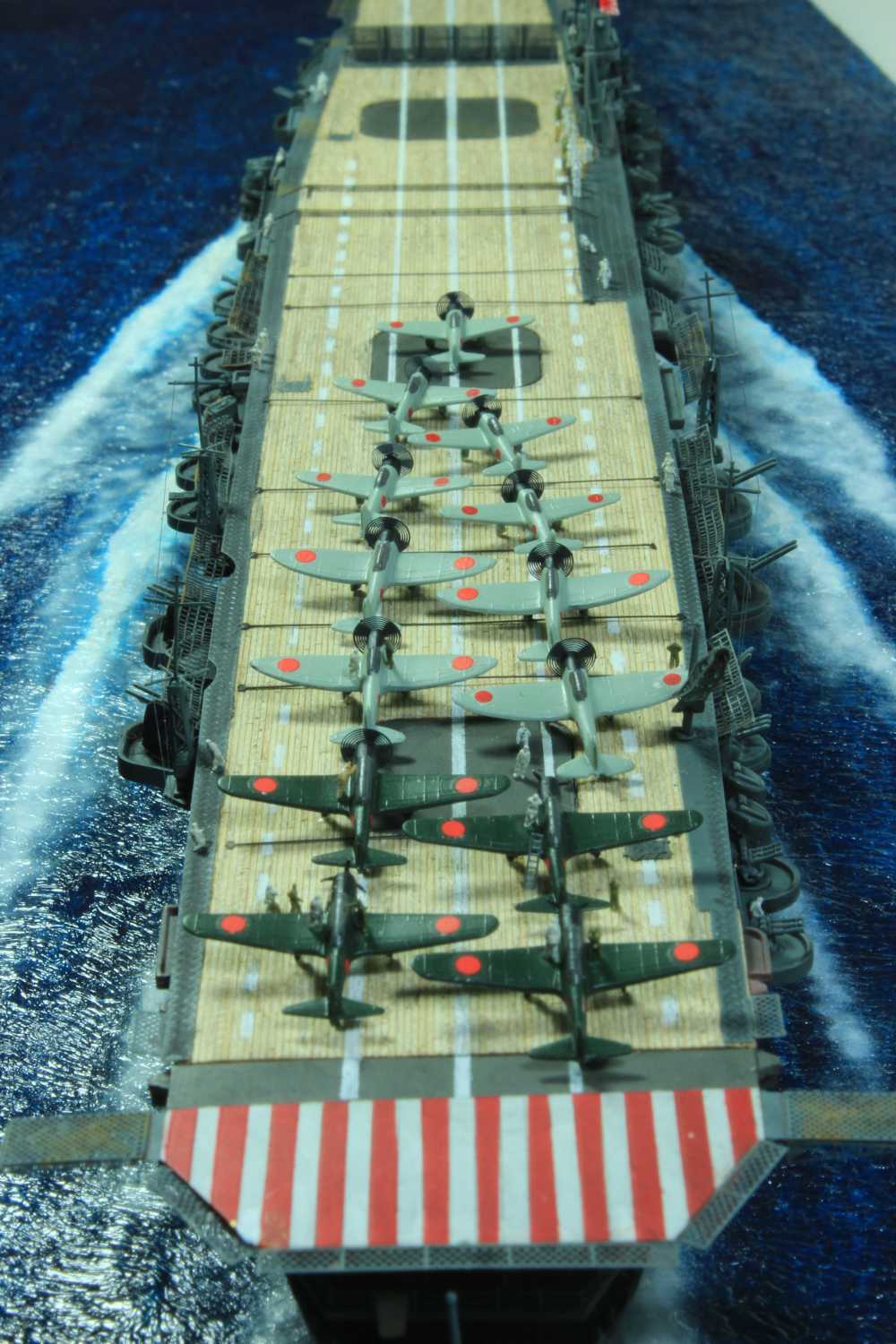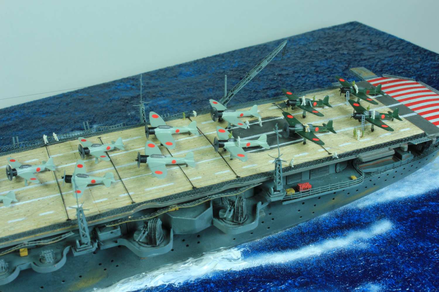 Die dem Bausatz beiliegenden A6M2 Zero (Zeke) und D3A Type 99 (Val) wurden mit Tamiya JN Gray, die B5 Type 97 (Kate) dagegen mit Tamiya JN Green mit Airbrush lackiert. Die schwarzen Motorhauben und die dunkelgrauen Cockpithauben hingegen wurden gepinselt. Nach einer Schicht Klarlack kamen die Abziehbilder drauf, die abschließend mit Mattlack versiegelt wurden. Final kamen stehende und rotierende Propeller an die Flugzeuge.