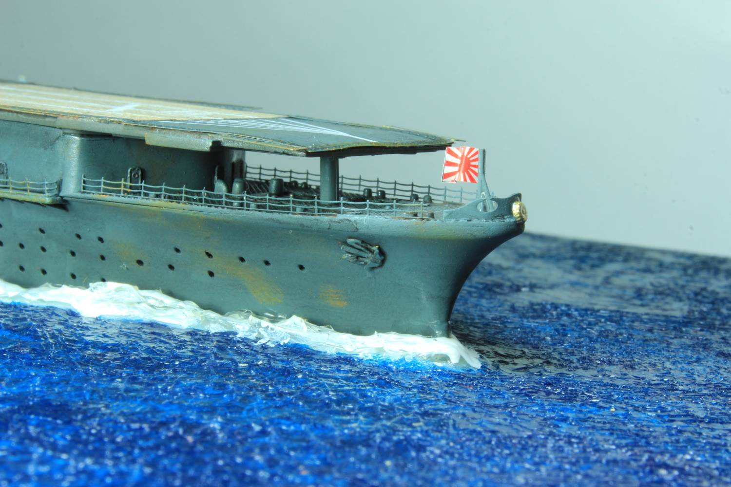 Die finale Montage bestand im Anbringen der Insel, des Dreibeinmastes, der vier fotogeätzten Gitterantennen, der Flugabwehrbewaffnung, des Windabweisers, des Bordkranes und der Fangseile. Nun konnten die Flugzeuge positioniert werden. Bei den Zeros und den Vals laufen die Motoren schon, bei den Kates stehen diese noch. Die von ION stammenden „Imperial Japanese Navy Carrier Personel & Pilots“ sind extrem gut. Die Körperhaltungen sind selbst nach dem Lackieren noch gut zu erkennen. Die Matrosen bekamen einen weißen und die Piloten einen grünen Anstrich mittels Pinsel. Im letzten Arbeitsgang konnten die Antennen und Flaggenleinen angebracht werden.