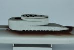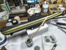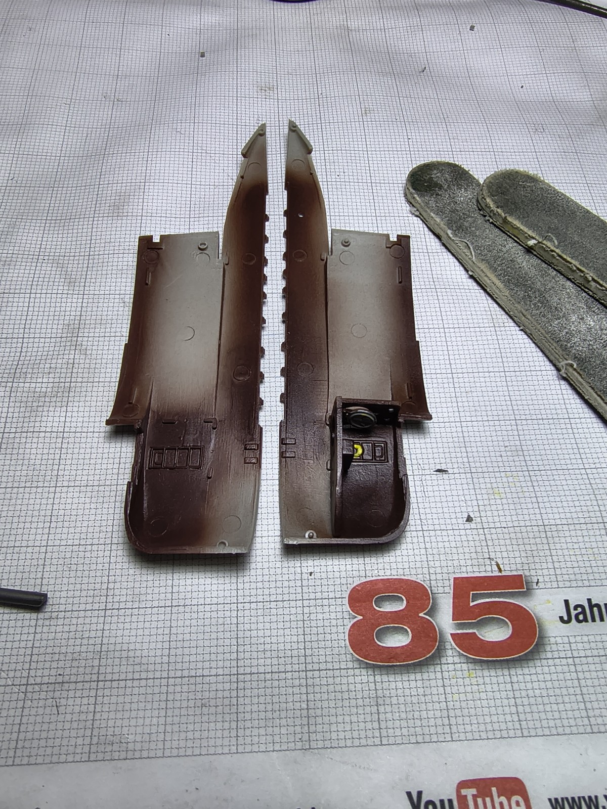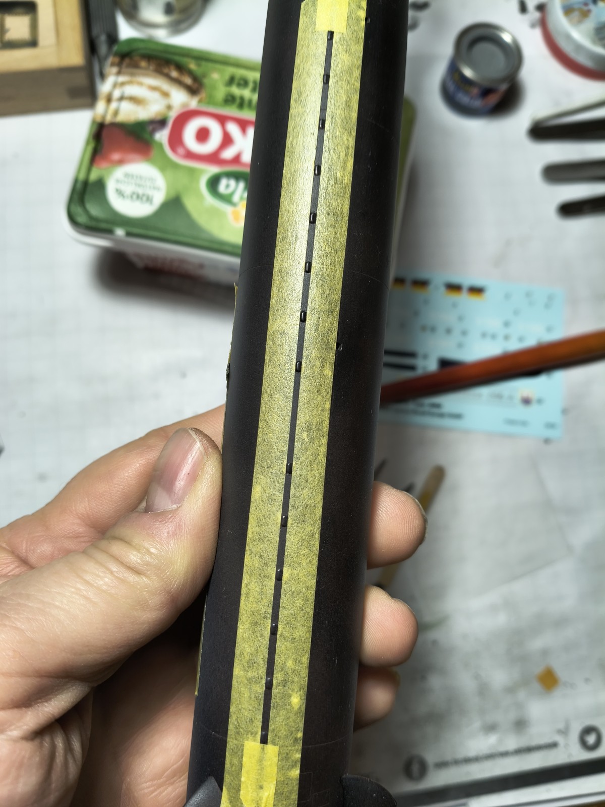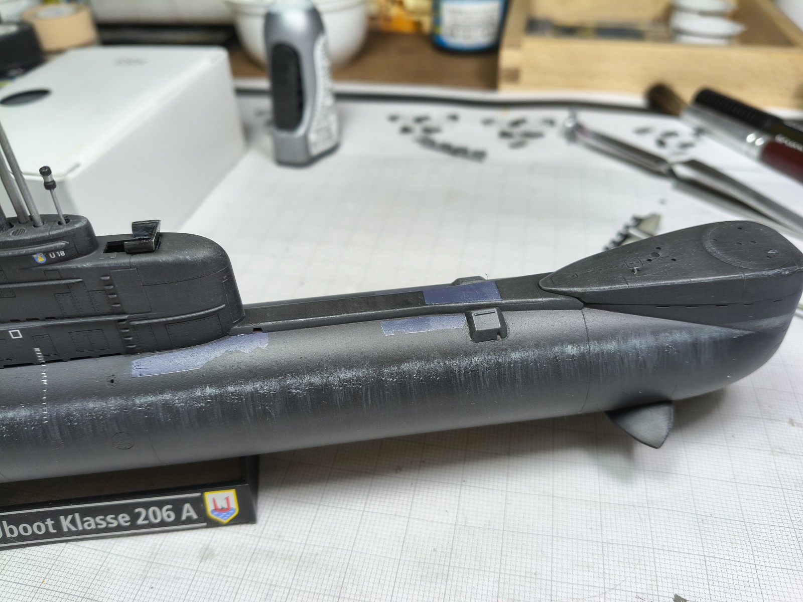 Farbangaben beziehen sich auf das Sortiment von Revell. Das ist kein Fehler, da diese einfacher zu beziehen sind, aber bei fünf Farben sind die Töne zu mischen, darunter die Farbe des Rumpfes, die mit „A“ angegeben ist. Diese wird aus 50% Lederbraun 84 und 50% Staubgrau 77 gemischt. Nach Vollendung des Rumpfes habe ich diesen zuerst in Lederbraun lackiert. In einem weiteren Durchgang habe ich lasierend Revell 302 Schwarz seidenmatt aufgetragen. Bei Tageslicht kann man das Braun noch leicht erkennen. Entlang des Kiels befinden sich kleine Rechtecke, die ich als Opferanoden erachte. Dazu habe ich zwei Tapestreifen links und rechts aufgeklebt und anschließend mit einem Silberstift die Rechtecke bemalt.