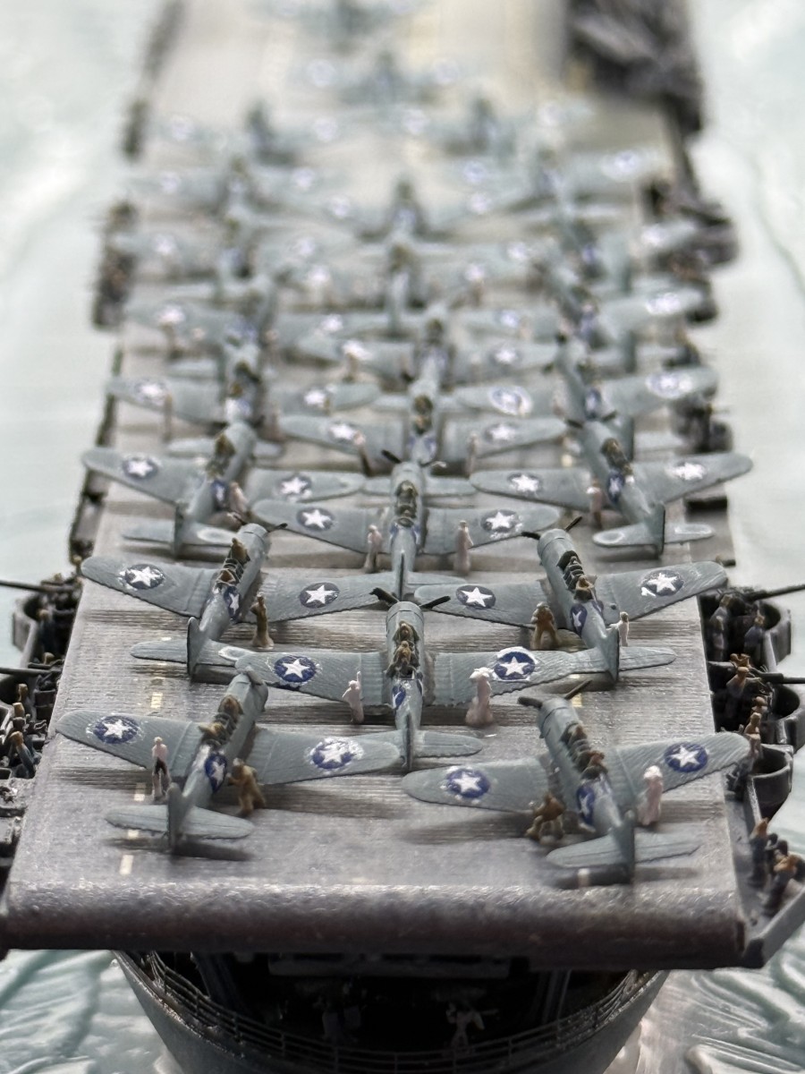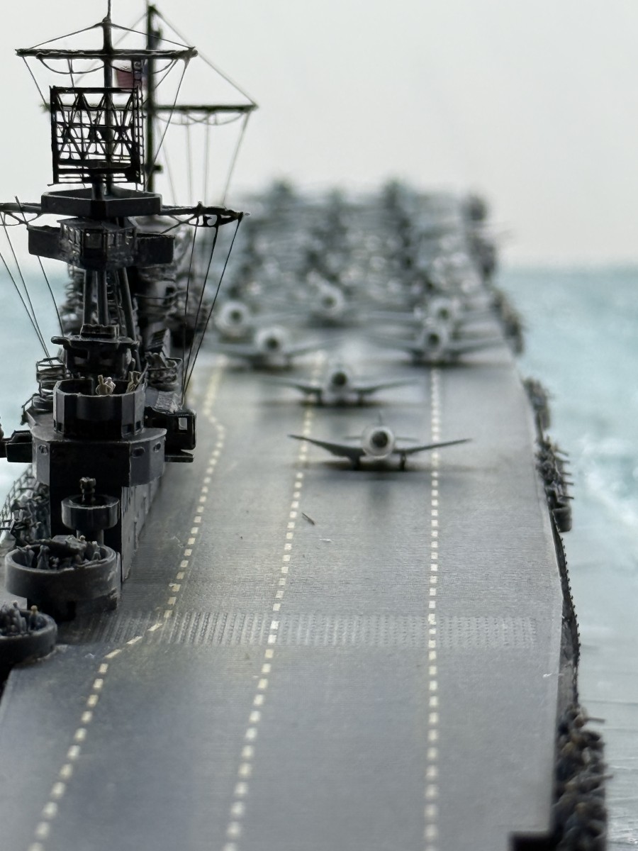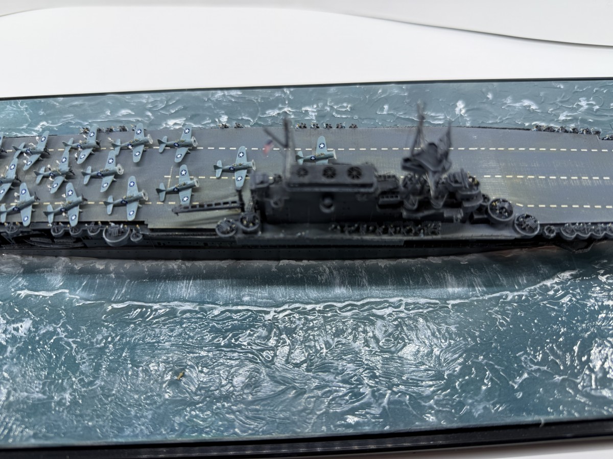Mein Modell der USS Enterprise zeigt den Zustand gegen 17:00 (Hawaii Standardzeit) des gleichen Tages. Die USS Yorktown war zu diesem Zeitpunkt durch japanische Luftangriffe außer Gefecht gesetzt worden, sodass alle Dauntless-Maschinen auf die USS Enterprise verlegt wurden. Gemeinsam mit den verbliebenen Maschinen der USS Enterprise wurde ein letzter Angriff auf die japanische Flotte gestartet, der zur Versenkung der Hiryu führte.