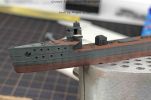 Um das Schiff in rauer See zu zeigen, habe ich teilweise den Unterrumpf aus Plastiksheet angedeutet. Die Handläufe sind aus Fotoätzteilen angefertigt und der Mastkorb aus dem Blech eines Teelichts neu gebogen.