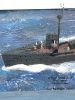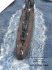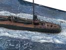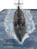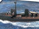 Die Wasserbasis besteht aus Styrodur. Die Wellenstruktur habe ich mit einem Löt-Feuerzeug nach Lust und Laune eingebrannt. Das Ganze wurde mit blauer Wandfarbe grundiert und mit der Airbrush aufgelockert. Das Wasser habe ich mit klarem Acrylgel dargestellt, die Wellen rund um das Schiff sind aus Watte. Im Anschluss habe ich die Wasseroberfläche vorsichtig trocken gemalt. Das Rigging ist - wie schon bei der Lützow - ein Mix aus Vinyl- und Drahtfäden.
