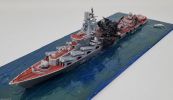 Aus aktuellem Anlass zur Versenkung des russischen Raketenkreuzers Moskwa (Москва, Moskva) des Projekts 1164 (Slawa) durch Treffer ukrainischer Neptun-Raketen am 13.4.2022 hier das Modell im Zustand nach Verlassen des Schiffs durch die Mannschaft, vermutlich am Morgen des 14.4. Entsprechende Bilder gingen relativ schnell online.