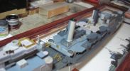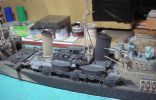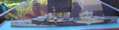 Das Modell des britischen Leichten Kreuzers HMS Belfast im Zustand nach Abschluss der Reparatur 1942 ist aus dem Bausatz von Trumpeter mit den Zubehörsatz von FlyHawk und 10,2-cm-Geschützen von NorthStar gebaut: