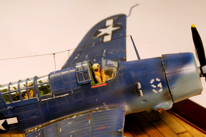 Auch wenn das hintere Geschütz unter der Haube nur noch wenig zu sehen sein wird, habe ich dem Teil doch noch den Schild gegönnt, der in der einzigen noch flugfähigen SB2C zu sehen ist.