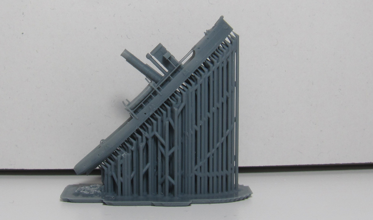 Das Modell besteht nur aus einem Teil. Aufbauten, Schornstein, Lüfter, Beiboote und Davits sind schon mit angedruckt (einer der Davits ist auf dem Foto abgebrochen). Das Modell ist sehr detailliert (aber auch sehr klein).