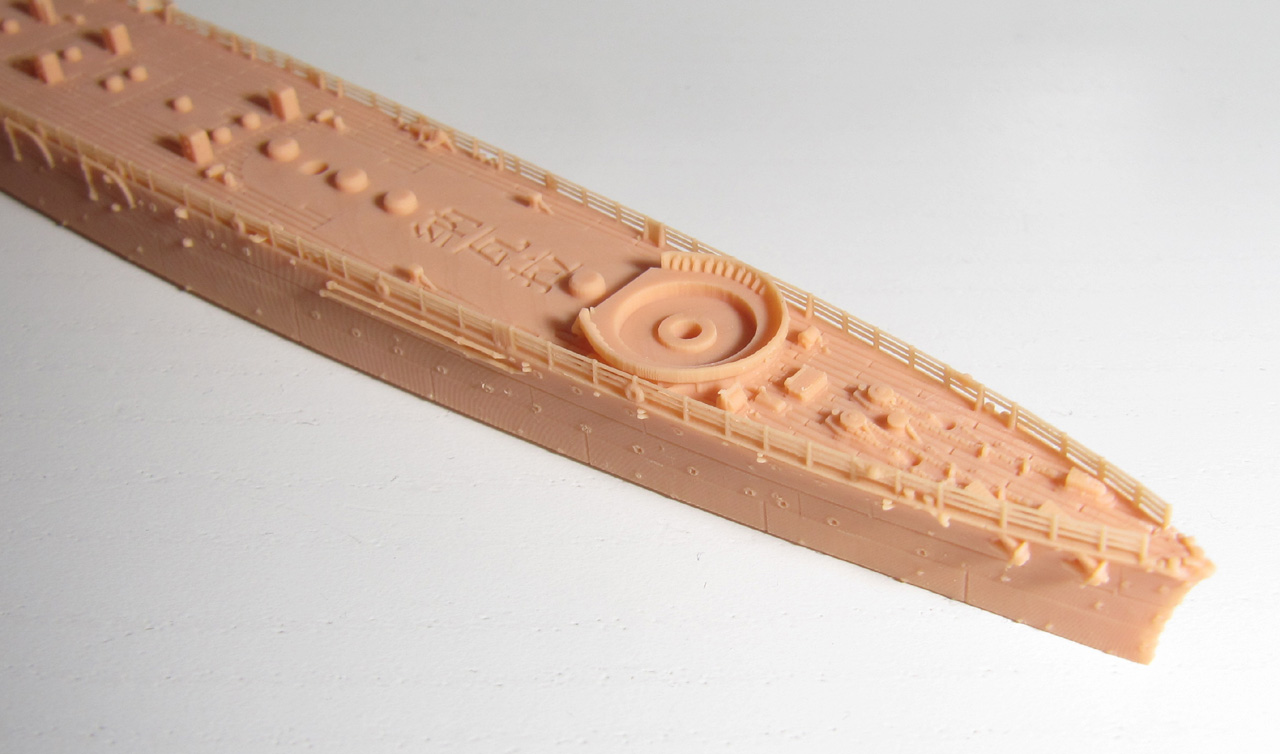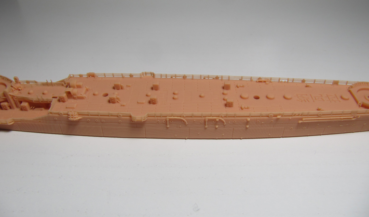 Der Rumpf ist hier nur bis zum Backdeck gedruckt. Der Rumpf ist von den Abmessungen und der Form vorbildgetreu. Die Detaillierung ist aber teilweise etwas grob, so sind die Gravuren für die Decksplanken relativ stark und die Gravuren an den Rumpfseiten sind stark übertrieben - bei Original wirken die Rumpfseiten glatt. Eine Reling ist angedruckt, aber relativ dick. Sehr merkwürdig ist ein massives, rundes Loch unterhalb des Ankers auf der Backbordseite (ist auf den Fotos nicht zu sehen, da es mir erst nach dem Fotografieren aufgefallen ist). Dieses Loch sieht man auch auf den Werbefotos auf eBay, auch etwas auf dem Titelbild ganz oben. Mir ist schleierhaft, was einen solchen Fehler in den Dateien verursachen kann. Man wird es verfüllen/verspachteln müssen, ohne den Anker und die Bullaugen in der Nähe zu beschädigen Bei meinem Exemplar beginnt sich der Rumpf etwas zu verbiegen (Bug und Heck nach unten). Es gibt unten im Rumpf eine Vertiefung, in die man ein Metallteil zu Stabilisierung des Rumpfs einkleben kann.
