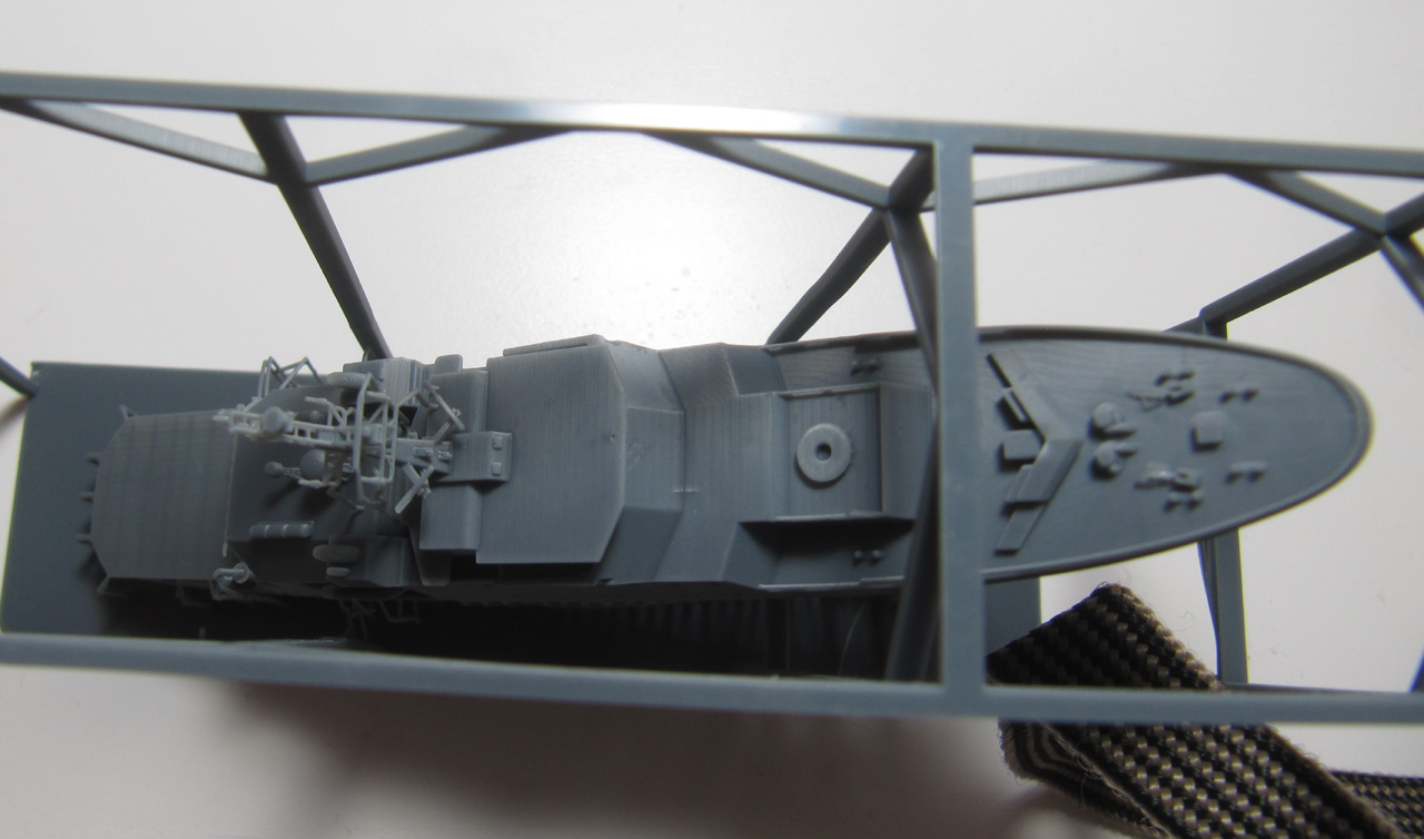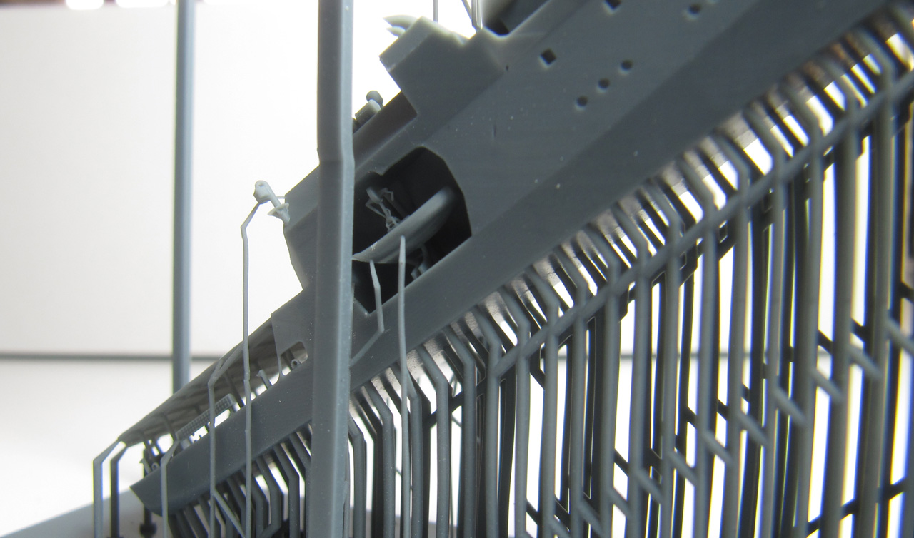 Der Rumpf ist komplett mit Aufbauten und Mast als ein Teil gedruckt. Der Druck ist von sehr hoher Qualität. Die Brückenfenster sind offen dargestellt, genauso der Hangar. Auch der Bereich unter dem Hubschrauberdeck ist gut detailliert, genauso die beiden Beibootbuchten. Auch der Mast ist sehr gelungen. Bei meinem Exemplar gibt es nur bei dem Beiboot auf der Steuerbordseite ein Problem: hier ist der hintere Teil der Schwimmer nicht richtig ausgeformt.