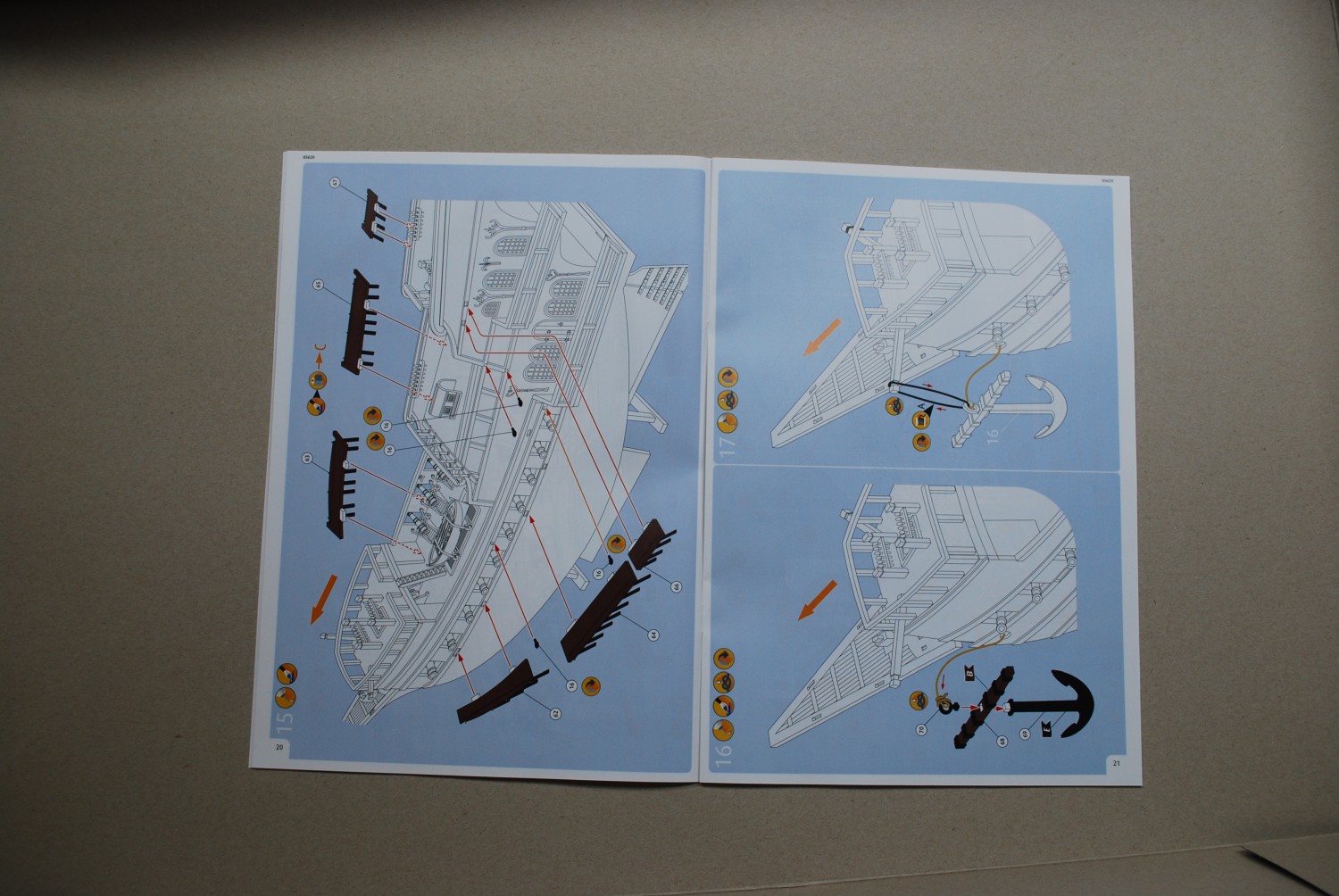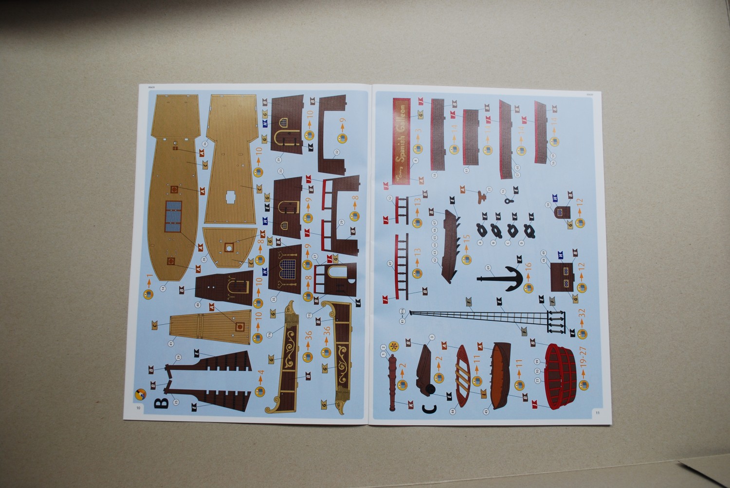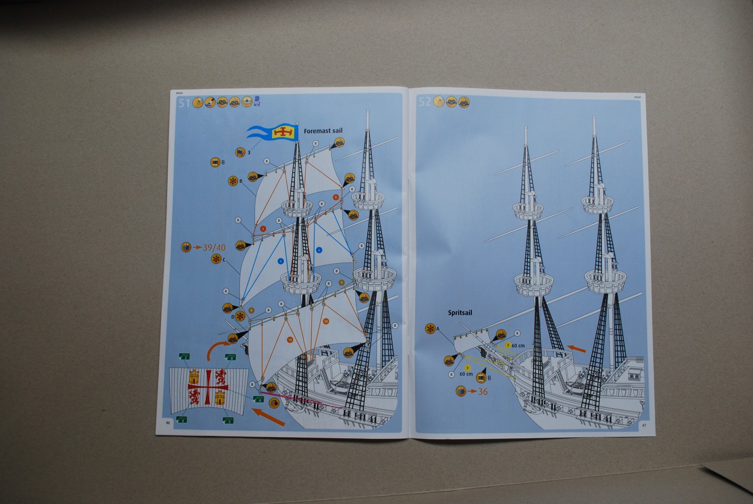 In der seit einigen Jahren üblichen Manier farbig in Heftform gestaltet, ist der Bauplan einfach und übersichtlich. Die Titelseite ziert ein gebautes Modell der Galeone mit dem Hinweis auf einen beiliegenden Sicherheitstext, auf den folgenden Seiten kommen die obligaten Basteltipps, eine Farbliste für das sehr bunte Schiff, die üppige Teileübersicht und der Hinweis auf die Ersatzteilversorgung durch die sehr schnelle und freundliche Abteilung X. Ab Seite 12 geht es dann mit dem Bastelvergnügen los. Zuerst werden bis Seite 23 Rumpf und Deck zusammengefügt und bemalt. Insbesondere die bunten Bordwände sollten vor dem Zusammenbau bemalt werden – es ist einfacher, wenn die Teile flach auf dem Tisch liegen. Ab Seite 23 beginnt die Takelung des Modells mit ersten Arbeiten am Bugspriet, dem schrittweisen Zusammenbau der Masten und dem Einbau der fertigen Baustufen. Auf Seite 30 geht es weiter mit dem Anknoten der ersten Blöcke an die Rahen, dann folgt das schrittweise Anbringen der Stage und Pardunen und schließlich die Takelung des laufenden Gutes zur Bedienung der Rahen und Segel. Wohl der Übersichtlichkeit geschuldet, hat Revell fast jeder Rah eine Baustufe jeweils für Toppnanten, Geitaue und Brassen gewidmet. Ob dies unbedingt so hilfreich ist, sei dahin gestellt. Auf jeden Fall gibt das Seiten im Bauplan. Mit dem Aufbringen der Naßschiebebilder mit Adlern, Löwen und den kastilischen Insignien auf die Segel zur Kennzeichnung der Galeone als königlich-spanisches Schiff beginnt die Takelung der Segeleinrichtung. Die letzte Seite befasst sich noch Bemalvorschlägen für die Kru. Direkt aus dem Kasten gebaut, wäre der Bau der Galeone hier abgeschlossen.