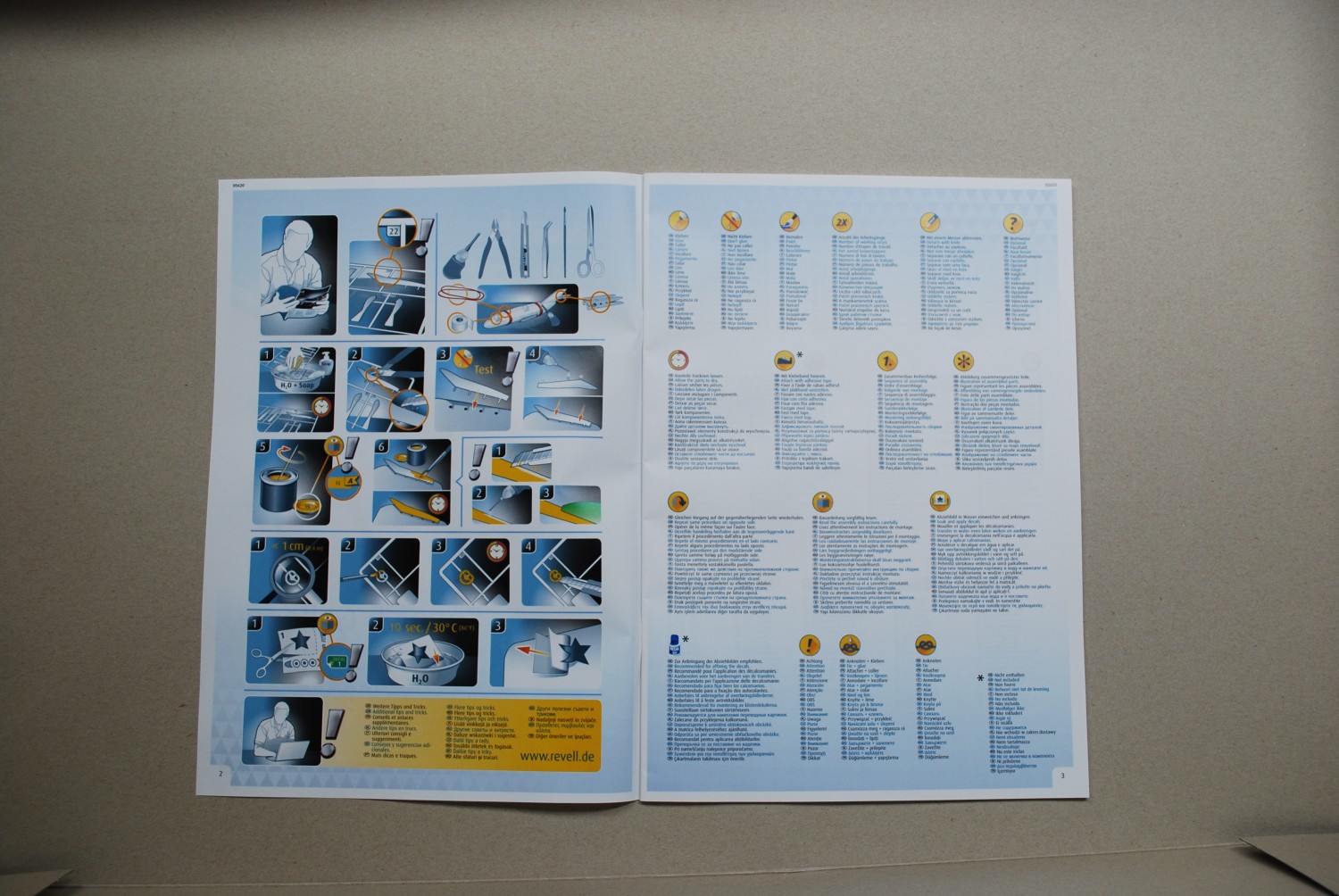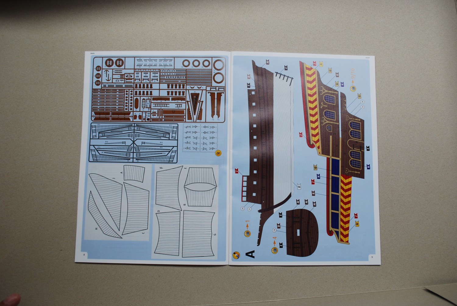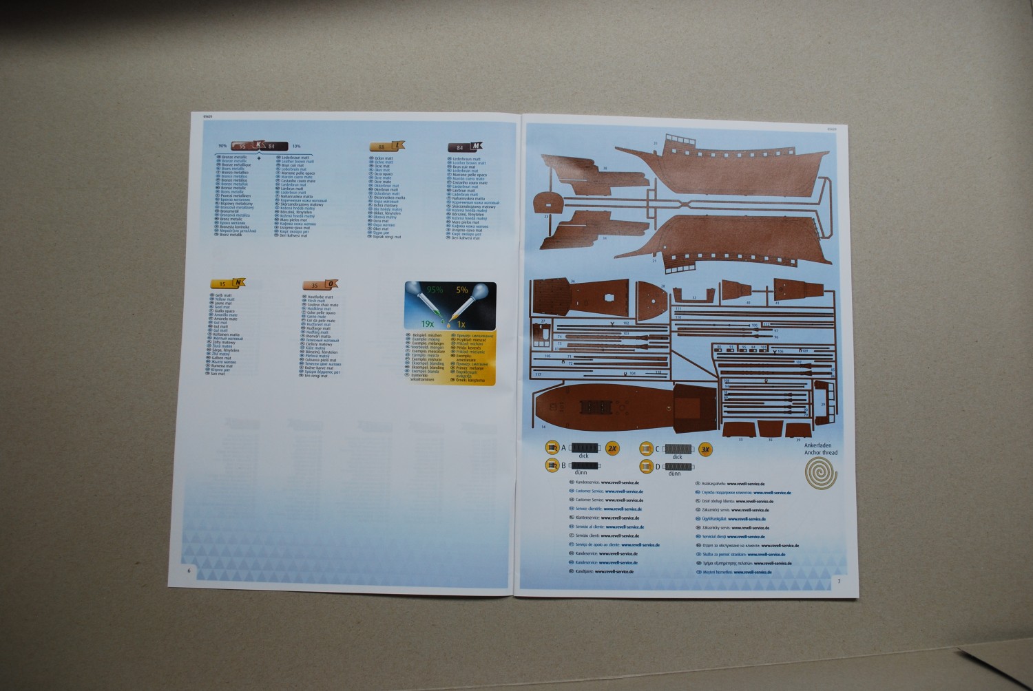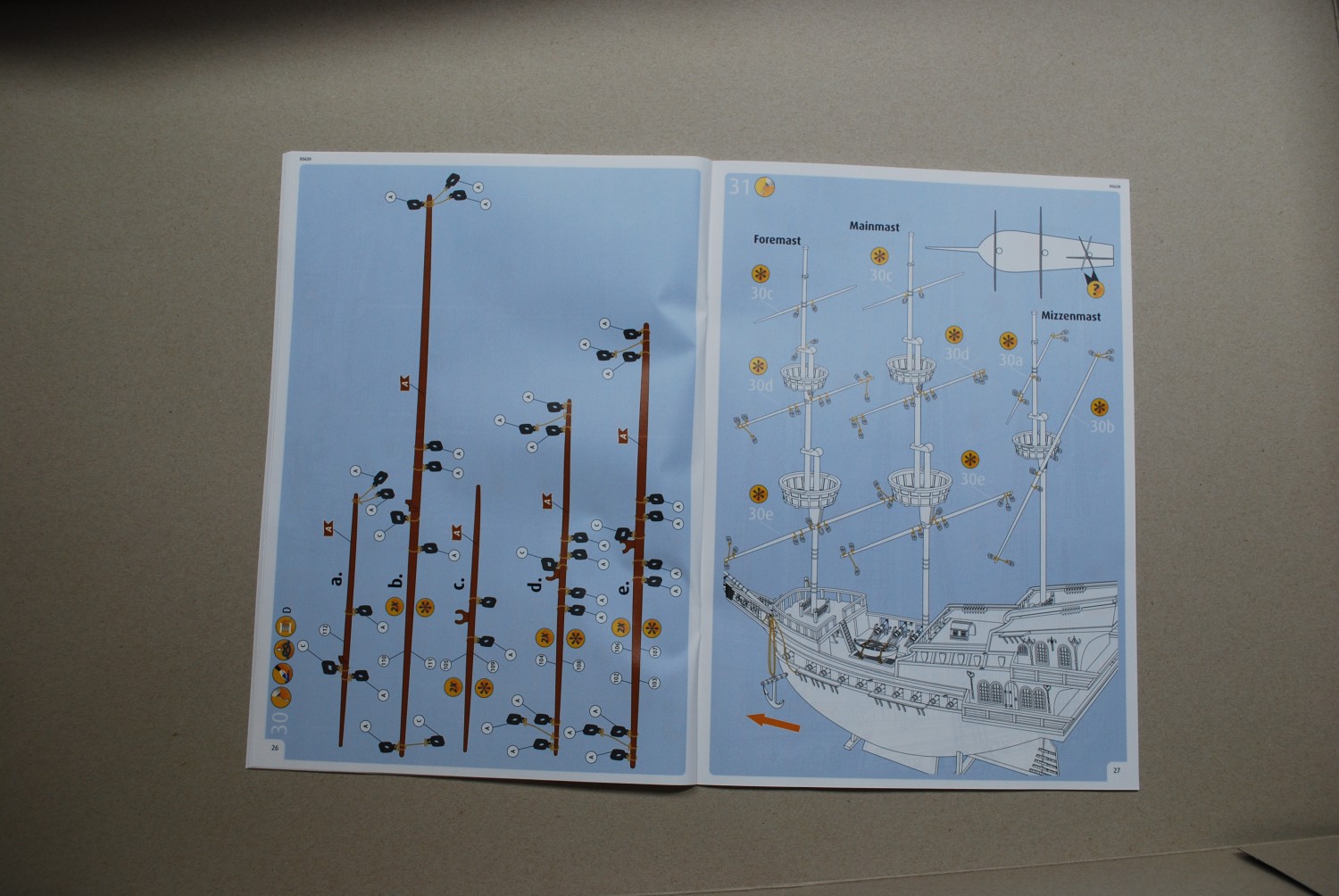 In der seit einigen Jahren üblichen Manier farbig in Heftform gestaltet, ist der Bauplan einfach und übersichtlich. Die Titelseite ziert ein gebautes Modell der Galeone mit dem Hinweis auf einen beiliegenden Sicherheitstext, auf den folgenden Seiten kommen die obligaten Basteltipps, eine Farbliste für das sehr bunte Schiff, die üppige Teileübersicht und der Hinweis auf die Ersatzteilversorgung durch die sehr schnelle und freundliche Abteilung X. Ab Seite 12 geht es dann mit dem Bastelvergnügen los. Zuerst werden bis Seite 23 Rumpf und Deck zusammengefügt und bemalt. Insbesondere die bunten Bordwände sollten vor dem Zusammenbau bemalt werden – es ist einfacher, wenn die Teile flach auf dem Tisch liegen. Ab Seite 23 beginnt die Takelung des Modells mit ersten Arbeiten am Bugspriet, dem schrittweisen Zusammenbau der Masten und dem Einbau der fertigen Baustufen. Auf Seite 30 geht es weiter mit dem Anknoten der ersten Blöcke an die Rahen, dann folgt das schrittweise Anbringen der Stage und Pardunen und schließlich die Takelung des laufenden Gutes zur Bedienung der Rahen und Segel. Wohl der Übersichtlichkeit geschuldet, hat Revell fast jeder Rah eine Baustufe jeweils für Toppnanten, Geitaue und Brassen gewidmet. Ob dies unbedingt so hilfreich ist, sei dahin gestellt. Auf jeden Fall gibt das Seiten im Bauplan. Mit dem Aufbringen der Naßschiebebilder mit Adlern, Löwen und den kastilischen Insignien auf die Segel zur Kennzeichnung der Galeone als königlich-spanisches Schiff beginnt die Takelung der Segeleinrichtung. Die letzte Seite befasst sich noch Bemalvorschlägen für die Kru. Direkt aus dem Kasten gebaut, wäre der Bau der Galeone hier abgeschlossen.