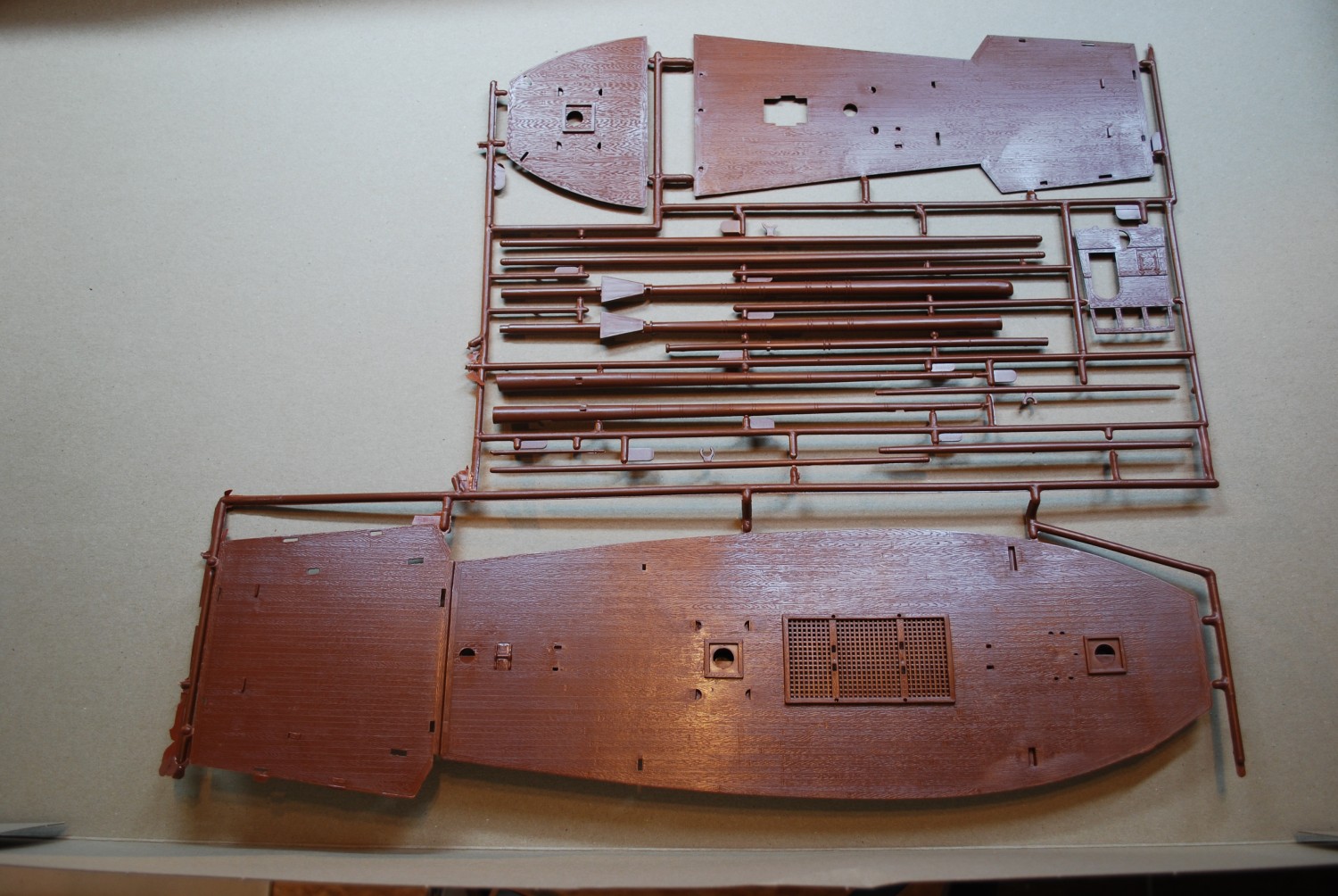 Der Bausatz hat eine Menge Potenzial, selbst aus dem Kasten gebaut wird daraus ein imposanter Zimmerschmuck. Erstaunlich ist das geringe Vorkommen von Fischhaut oder Formversatz bei dem alten Bausatz. Dennoch ist bei einigen Teilen vor dem Bemalen ein wenig Verputzen notwendig. Die Plastikteile haben vielfach eine fein erhabene Holzmaserung; eigentlich ja Quatsch, denn Schiffswände, Decks und andere Holzteile waren relativ glatt und die Maserung des Holzes an nicht bemalten Stellen zwar sichtbar, aber nicht erhaben. Diese Holzstruktur ist letztendlich nur hilfreich bei einer holzähnlichen Bemalung. An den Plankenstößen sind sogar Nagelköpfe als kleine Kringel dargestellt. Auch die kann man natürlich diskutieren, haben doch die meisten Holzschiffe, egal welcher Epoche, einen wie auch immer gearteten Schutzanstrich, der eine Nagelung nahezu unsichtbar macht. Mehrere Fensteröffnungen mit rautenförmigen Fenstergittern im Achterkastell sind leider geschlossen dargestellt. Hier bietet es sich an, die Fenster zu öffnen und mit geätztem Messinggitter aus dem Zubehörmarkt oder selbst gebauten Gittern zu versehen.