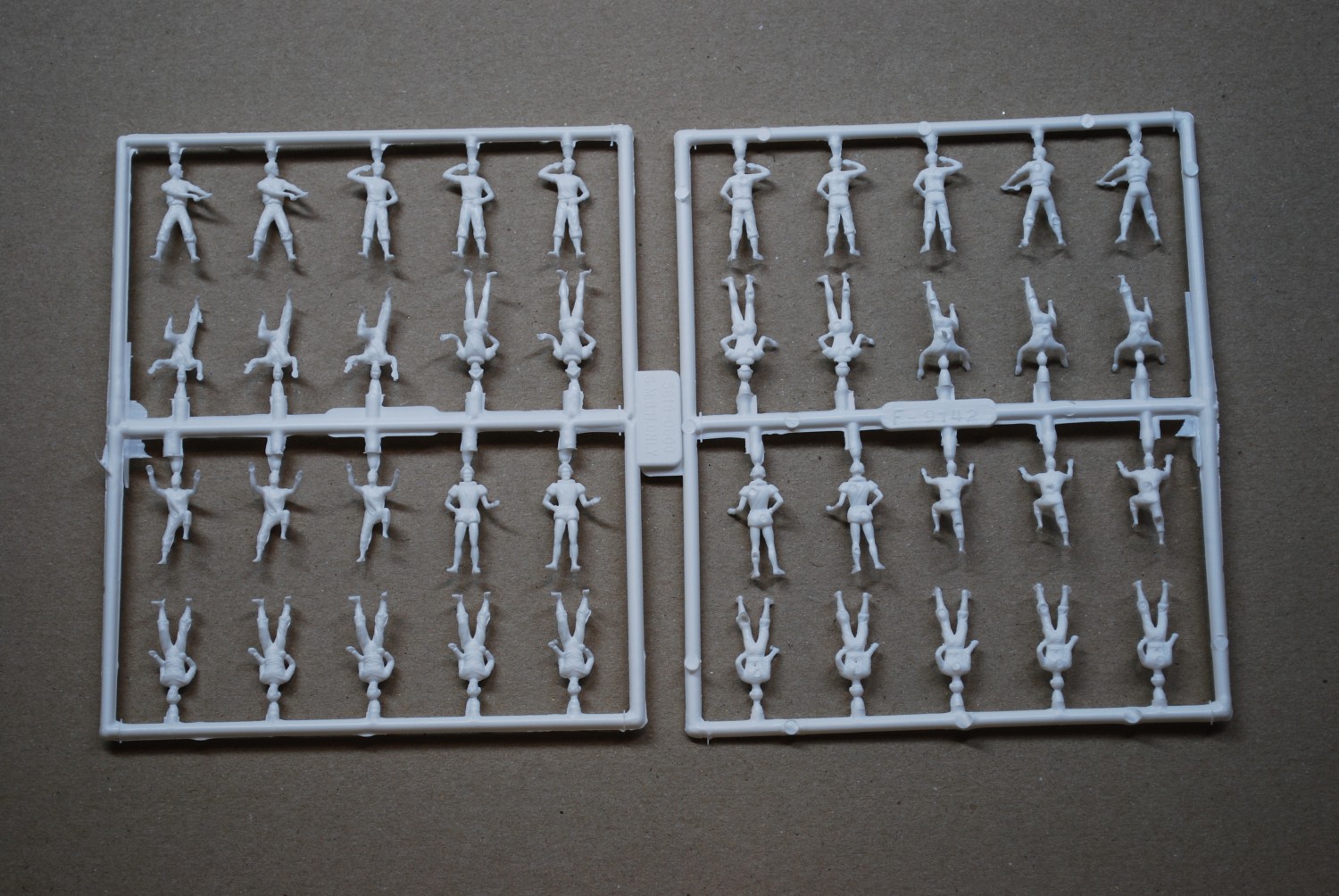 Das Modell kommt in einem etwas zu großen Karton mit schönem Deckelbild daher. Es zeigt das Schiff unter vollen Segeln von steuerbord. Die großen Spritzrahmen liegen in einer Klarsichtplastiktüte, ebenso die separat verpackten 40 Figuren sowie Flaggen und Abziehbilder. Eigentlich nicht weiter schlimm, sind eben diese Teile ohnehin zu schwach um den Zug der Taue aufzunehmen. Sicherlich würde aber Abteilung X auch für Ersatz sorgen. Dennoch ein Grund, vielleicht insgesamt über die Verpackung solch großer Plastikbausätze nachzudenken und eine Unterteilung oder andere Arten der Polsterung einzubauen.