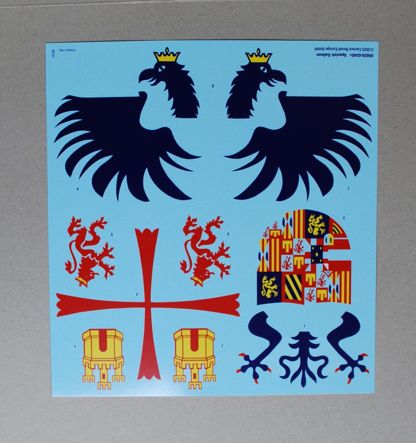 Dieser Bausatz scheint die ursprüngliche Auflage zu sein – bevor aus dem Papistenkahn ein gotteslästerlicher Engländer wurde. Das Schiff fährt hier nur drei Masten, hat einen Adlerkopf am Galion und zeigt die spanischen Farben und Insignien. Das macht den betagten Bausatz durchaus noch interessant, ist die „Spanische Galeone“ doch vier Jahre vor dem englischen Konvertiten auf dem Markt gewesen.