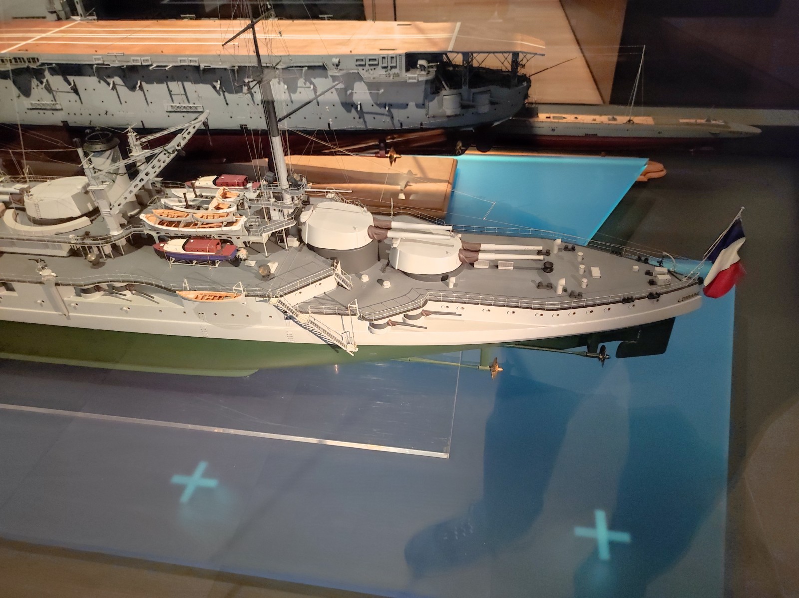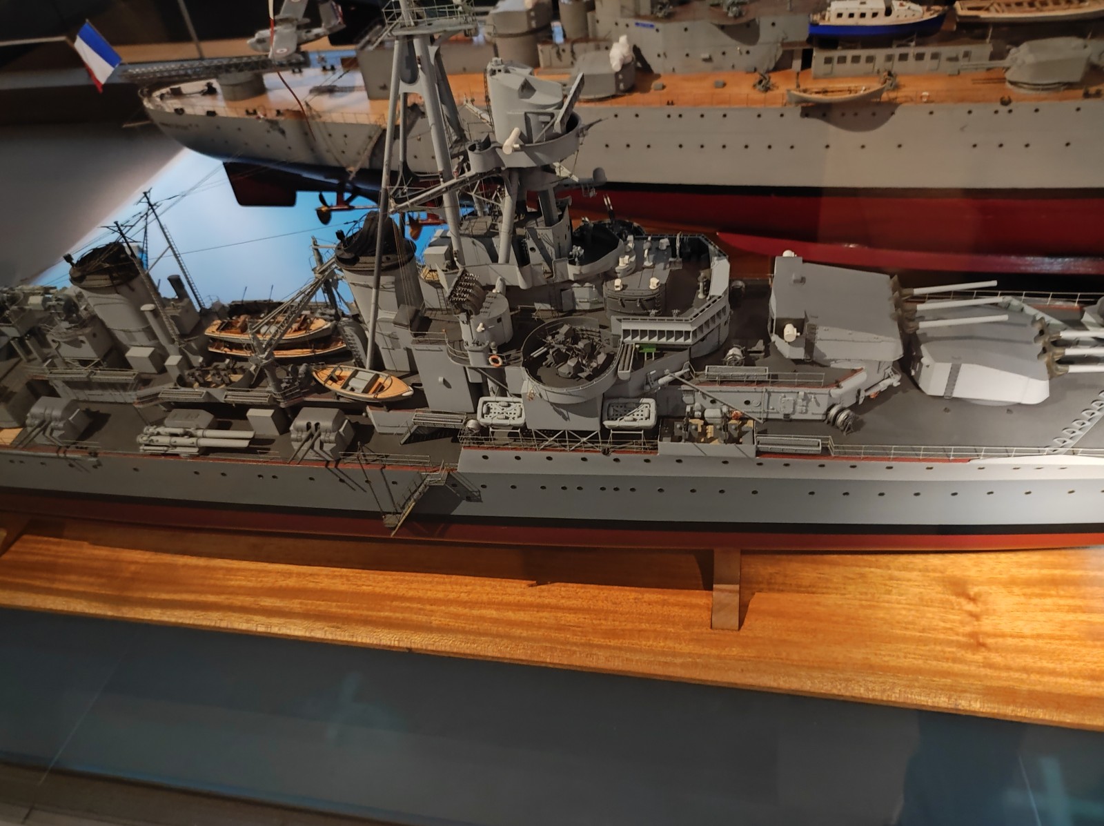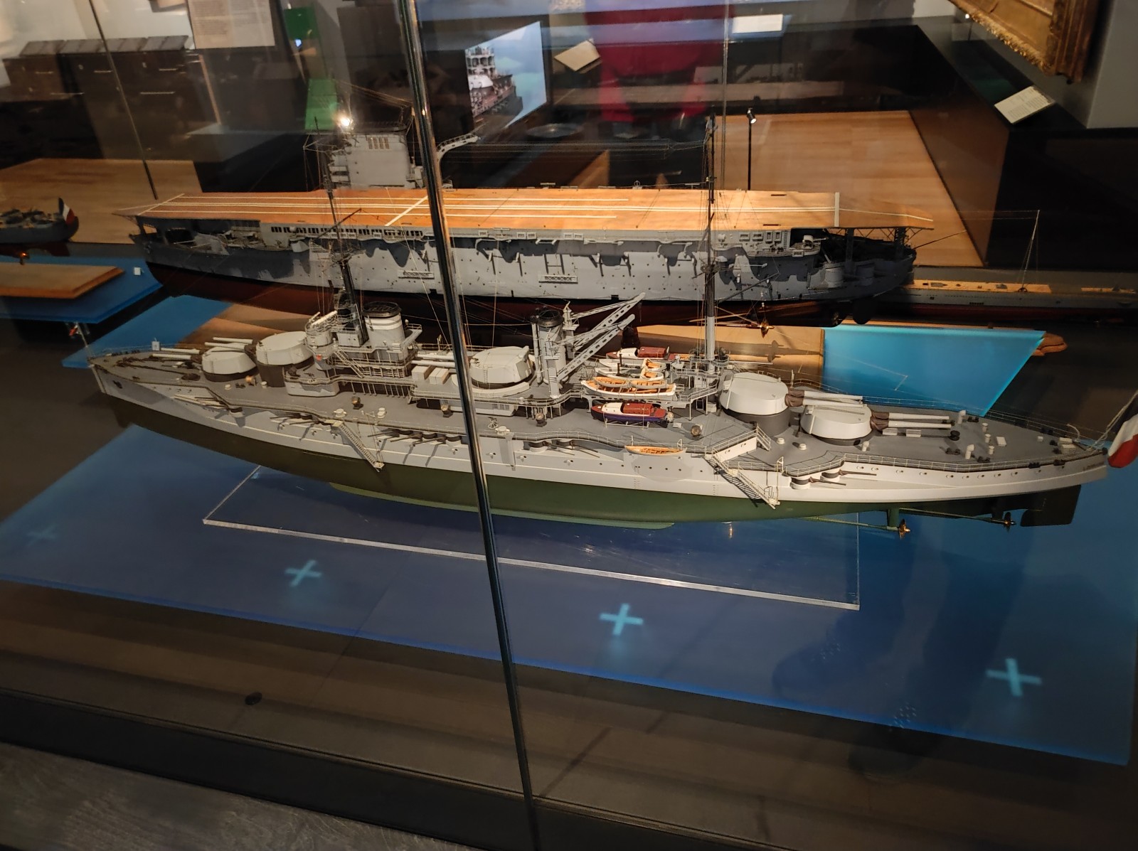 Weiter geht es mit Modellen im Musée national de la Marine de Paris aus der Zeit des Zweiten Weltkriegs, darunter der Flugzeugträger Béarn, der Leichter Kreuzer Georges Leygues, die Korvette Aconit sowie die Schlachtschiffe Lorraine, Dunkerque und Richelieu.