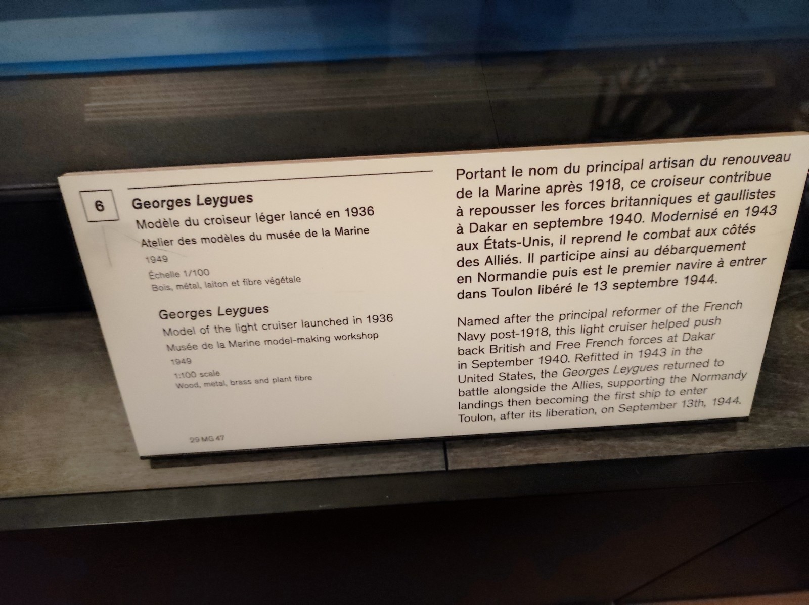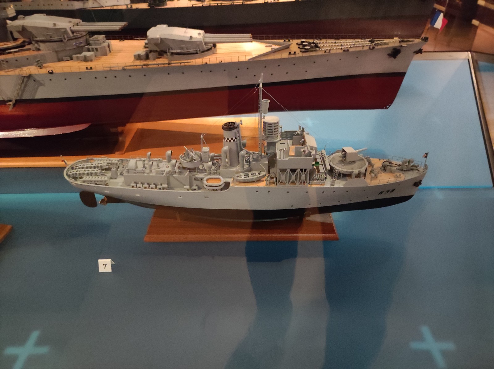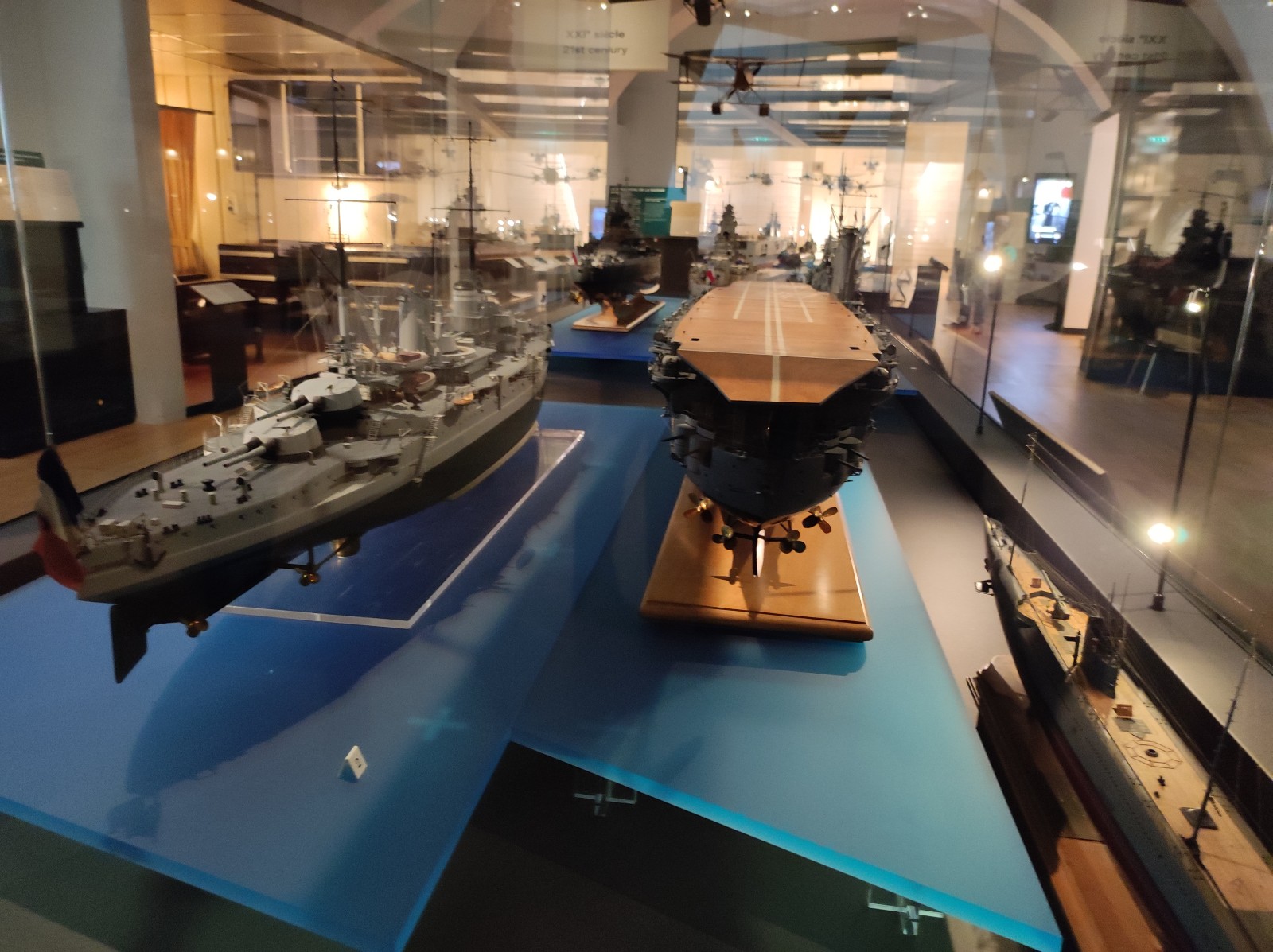Weiter geht es mit Modellen im Musée national de la Marine de Paris aus der Zeit des Zweiten Weltkriegs, darunter der Flugzeugträger Béarn, der Leichter Kreuzer Georges Leygues, die Korvette Aconit sowie die Schlachtschiffe Lorraine, Dunkerque und Richelieu.