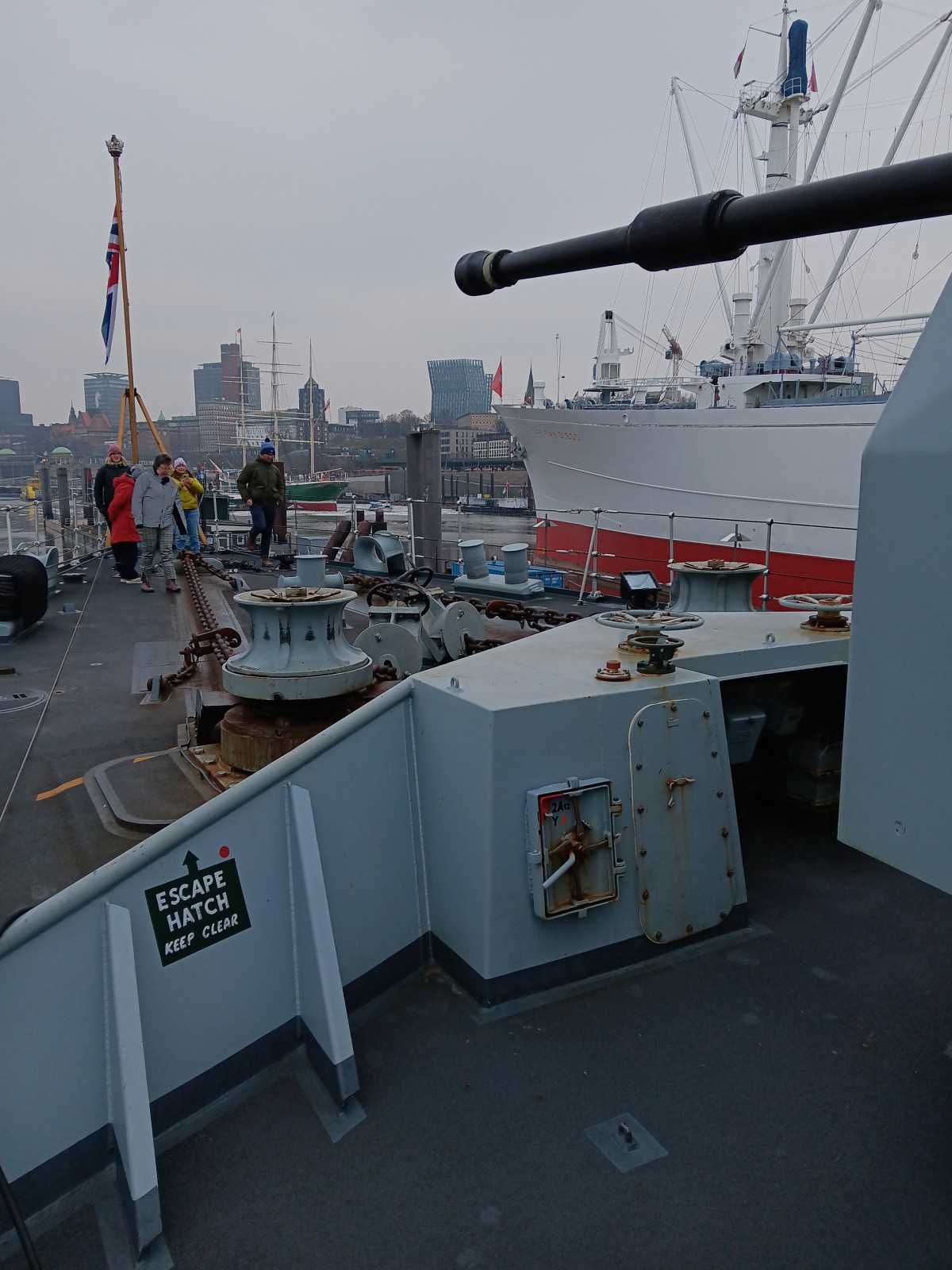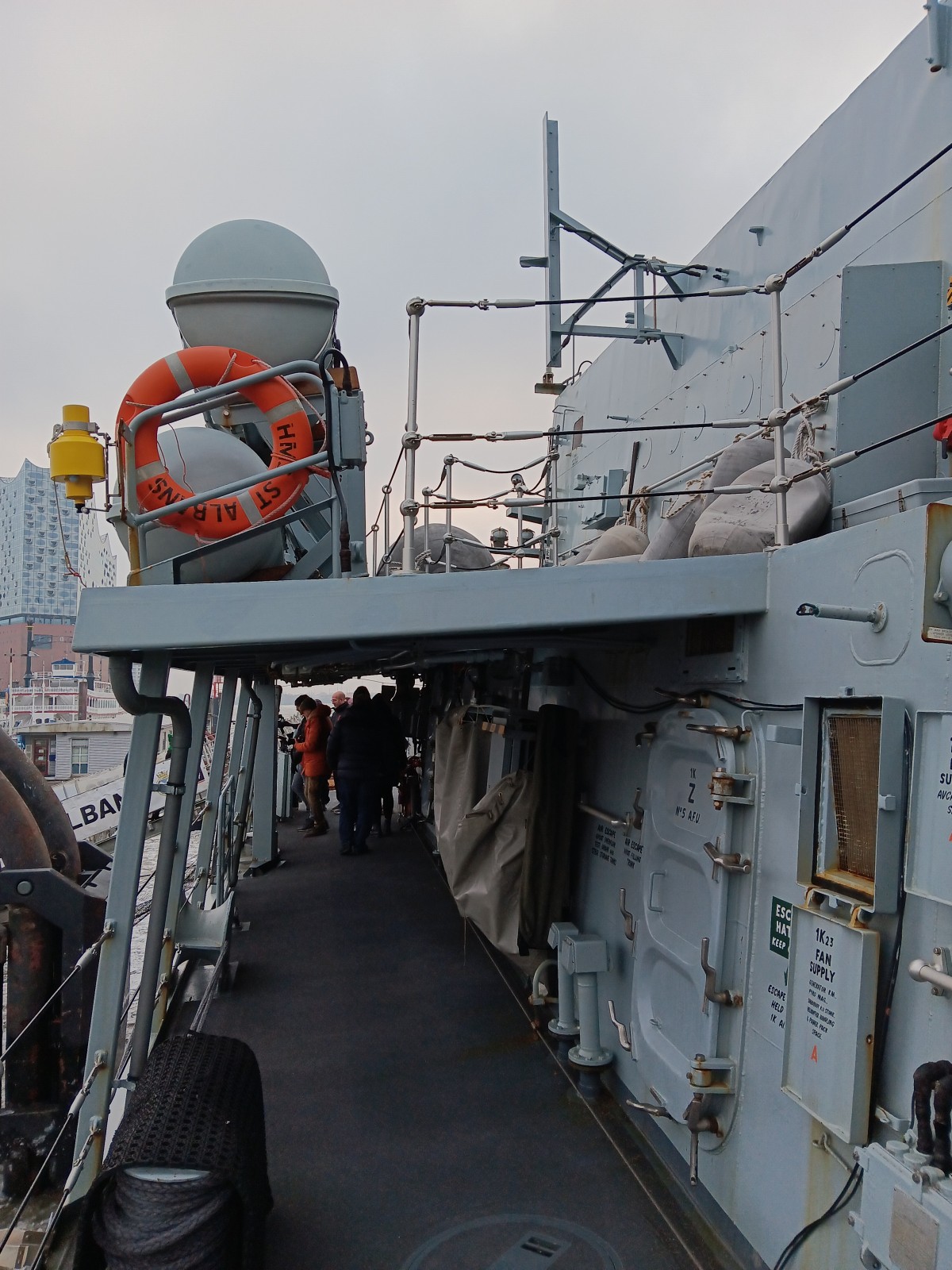 Bei Minusgraden nutzte ich die Gelegenheit, die Fregatte der Royal Navy St Albans zu besuchen. Zum „Open Ship" wurde am Samstag, den 24. Januar 2026 ab 10 Uhr eingeladen. Es konnten das Oberdeck und der Flugzeughangar besichtigt werden. Die Besatzung hatte dazu einiges an Gerät und Bewaffnung zur Demonstration aufgebaut und ausgelegt. Fragen wurden sehr gerne und sehr ausführlich beantwortet. Der Schiffsentwurf stellt für mich noch ein klassisches Kriegsschiff aus der Zeit dar, bevor das Zeitalter des Stealth-Designs anbrach, um Radarsignaturen gering zu halten. Eigentlich sollte auch das französische Küsten-Patrouillenboot FS Pluvier kommen, dessen Besuch jedoch abgesagt wurde. Bei meinem Besuch waren weder ein Bordhubschrauber noch die ursprünglich zur Bewaffnung gehörenden Harpoon-Starter bzw. die sie ersetzenden NSM-Starter vor dem vorderen Aufbau zu sehen.