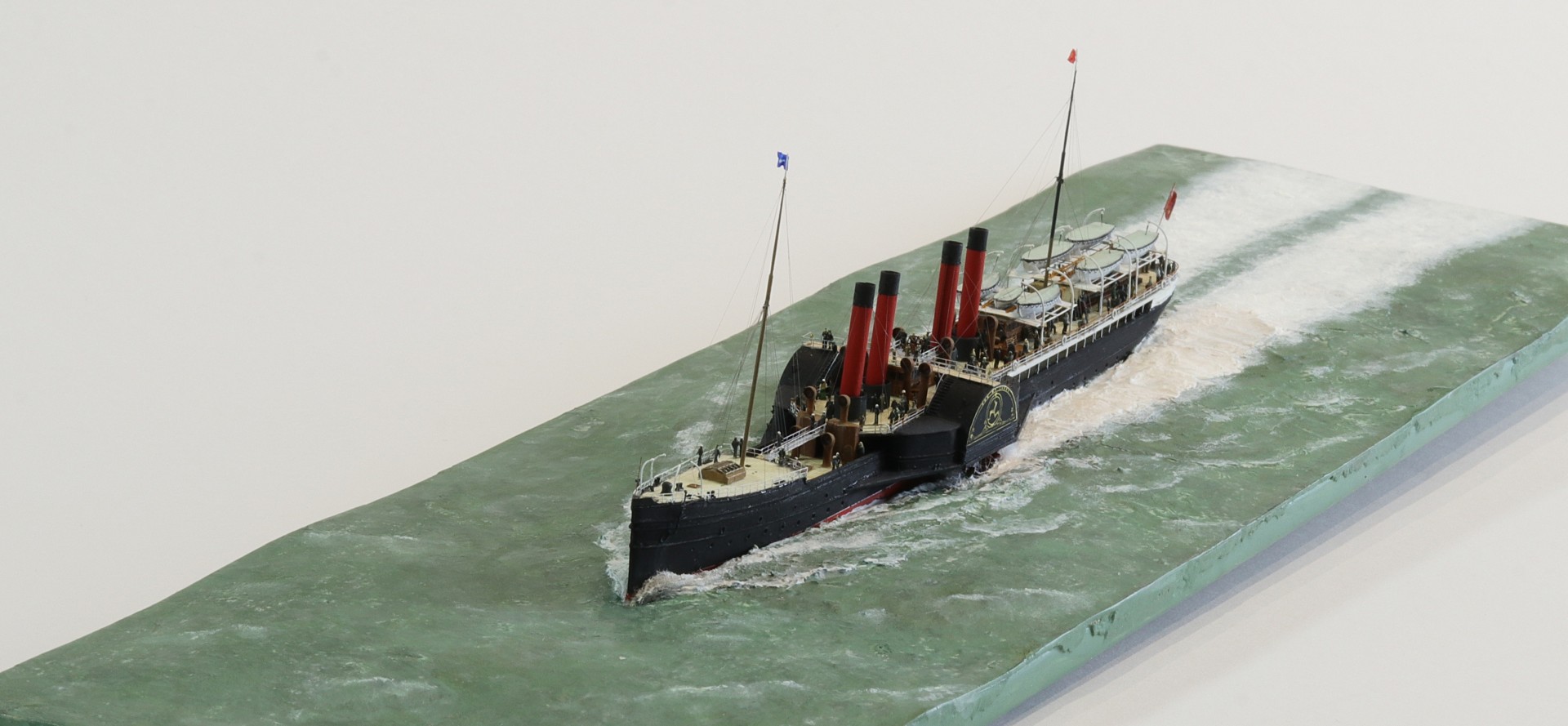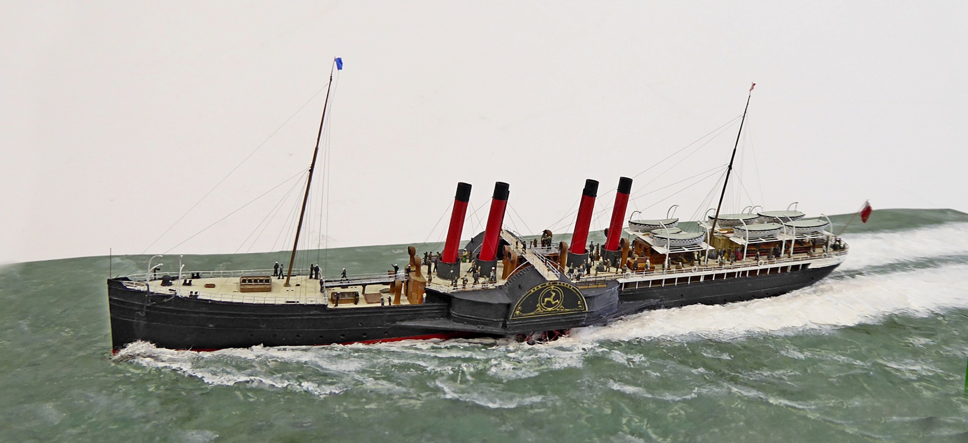 Das Logo und die Verzierungen an den Schaufelkästen sowie die Heckornamente und der Schiffsname wurden speziell für mich gezeichnet und mehrfach (!) als Decals auf einem A4-Bogen gedruckt, sodass zahlreiche Ersatzteile in unterschiedlichen Größen mit Abstufungen von jeweils ±0,1 mm zur Verfügung standen. Die einzigartigen Beiboote wurden eigens entworfen und von einem Freund in Frankreich in 3D gedruckt. Passagiere und Besatzung sind 1/700-3D-gedruckte Zivilfiguren der deutschen Firma Modellbauray.com.