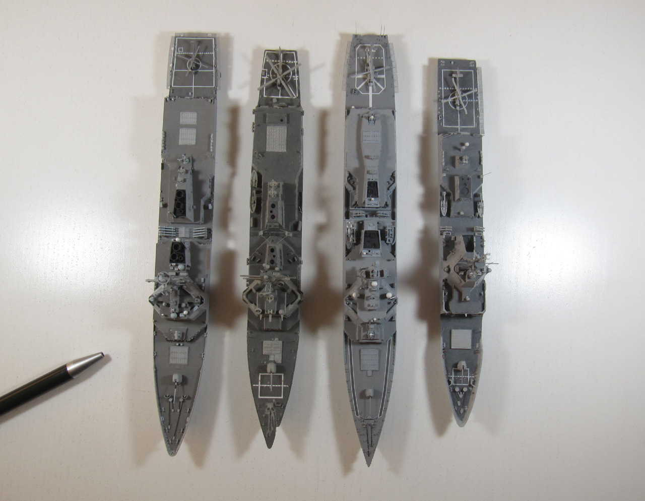 Für die Bemalung nutzte ich Acrylfarben von Vallejo Model Color: 154 (989) Signalgrau für die vertikalen Teile des Anstrichs, 159 (991) Staubgrau für die Decks (also wie ich auch Schiffe der US Navy bemalen würde), 167 (995) Anthrazitgrau für die Schornsteinkappen, 152 (883) Hellgrau für die SPY-1-Radarantennen und 158 (870) Mittelgrau für den Super Lynx-Hubschrauber. Die Tore der Beiboothangar sind etwas schwierig darzustellen. Ich bemalte sie mit einer 1/1-Mischung aus 136 (818) Rotes Leder und 153 (907) Hellblaugrau. Die Abziehbilder nahm ich aus dem Bausatz.