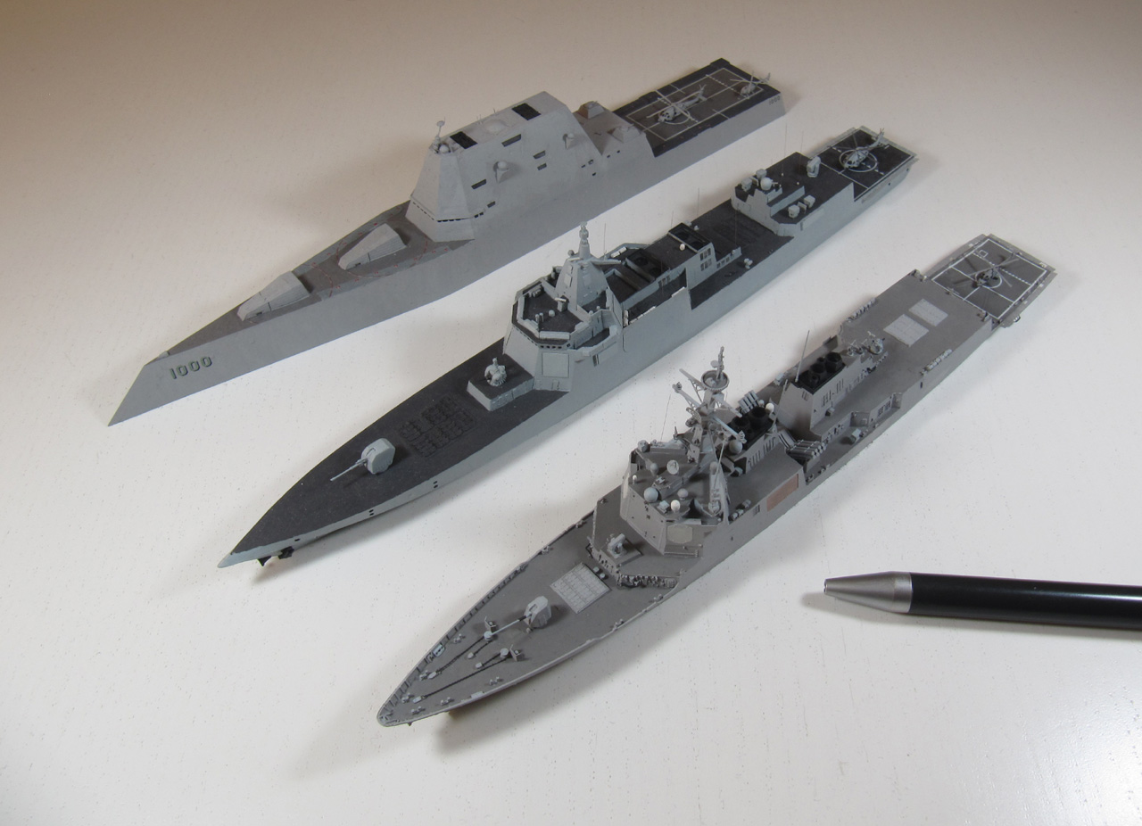 Links Sejong Daewang mit zwei anderen großen Lenkwaffenzerstörern: chinesische Nanchang (2019, Typ 055) und USS Zumwalt (2016, Typschiff der Klasse). In der Mitte mit zwei anderen heutigen Lenkwaffenschiffen, dem chinesischen Zerstörer Kunming (2014, Typ 052D) und der niederländischen Fregatte Zr. Ms. Evertsen (2005, LCF). Rechts mit zwei älteren Schiffen, dem französischen Leichten Kreuzer Lamotte-Picquet (1927, Duguay-Trouin-Klasse) und dem britischen Leichten Kreuzer HMS Chester (1916, Birkenhead-Klasse).