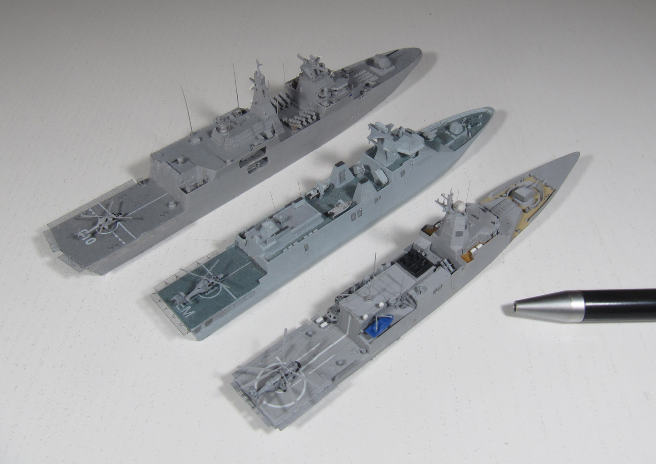 Die Passgenauigkeit der Plastikteile war nicht perfekt, insbesondere mittschiffs im Bereich um die Uran-Starter. Auch bei dem 3D-gedruckten Mast und oberen Teil des Schornsteins hatte ich etwas Schwierigkeiten, die Teile ohne Spalten anzukleben. Die fotogeätzte Reling auf den Brückenflügeln (PE10/11) passte auch nicht perfekt. Das Original hatte 2024 keine Salutgeschütze vor der Brücke und anscheinend auch keine schweren 1,45-cm-Maschinengewehre - entsprechend kamen auch keine an Bord. Ich ergänzte noch aus 0,05-mm-Kupferdraht die Stabantennen auf der Brücke, da die Ätzteile zu dick waren.