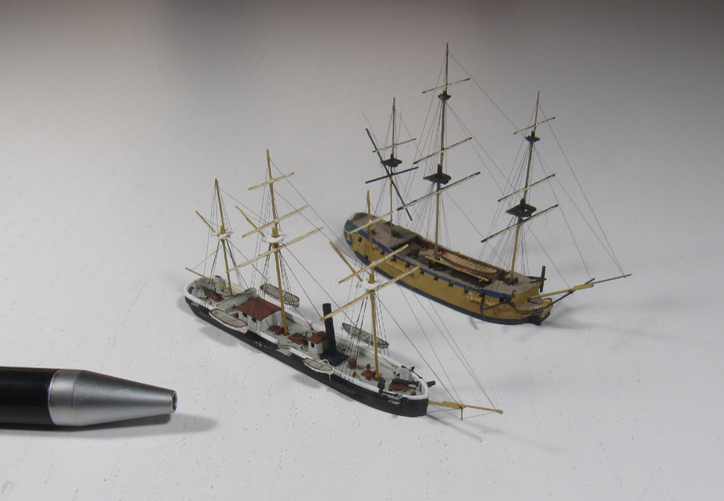 Die Meteor war ein sehr sehr kleines Schiff, deshalb interessant, dass ein typischer Kreuzer aus der ersten Hälfte des 18. Jahrhundert, das britische 24-Kanonenschiff HMS Rose (1740), noch kürzer war (linkes Foto). Rechts die Meteor mit zwei Kreuzern aus dem 19. Jahrhundert: der dänischen Hekla (1842) und der chinesischen Fupo (1871).