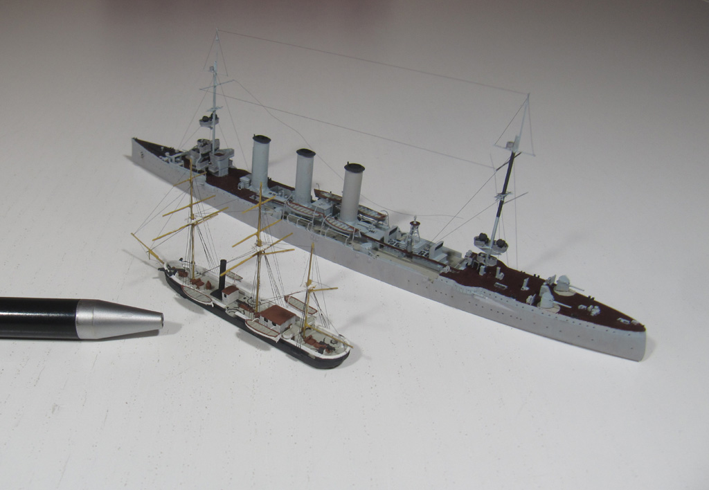 Das Modell bemalte ich mit Acrylfarben von Vallejo Model Color: 167 (995) Anthrazitgrau für Rumpf und Schornstein, 4 (820) Cremeweiß für die Innenseite der Schanzkleider, die Deckshäuser und die Beiboote, 110 (986) Achatgrau für die Decks, 139 (846) Mahagonibraun für die Dächer der Deckshäuser und 121 (913) Ockergelb für die Masten und Rahe.