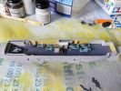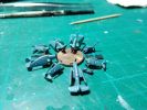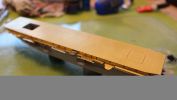 Auf dem Deck habe ich den Rückkehr der Avenger nach einem Einsatz dargestellt. Während ein gerade gelandete Maschine am Bug noch mit laufendem Motor abgestellt wurde, kommt schon die nächste zur Landung angeflogen. Hierbei wurden die Fangseile schon aufgestellt. Ob in so einer Situation der vordere Aufzug bereits nach unten gefahren wurde, kann ich nicht beurteilen, jedoch wollte ich auch dies darstellen. Die landende Avenger wurde mittels Weißleim an die Wand der Vitrinenhaube angebracht.
