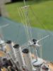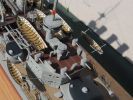 Das Modell hat einen Resinrumpf, den ich als zwei Halbschalen gegossen habe. Das Urmodell entstand aus Pappespanten mit einer Auffüllung der Form mit Plastilin, davon habe ich ein Gipsnegativ gezogen. Die Gipsform bekam dann einen Konter mit Kern, sodass besagte Halbschalen von ca. 4 mm Dicke herauskamen. Das hat auf Anhieb ganz gut funktioniert. Das sichtbare Deck ist Karton, wo ich die Enamel-farbe von Revelll nicht draufgepinselt, sondern eingerieben habe, anschließen wurden mit dem Drucker die Plankengänge aufgedruckt. Die Aufbauten und viele Details sind aus Fotoätzteilen nach meinen selbstgemachten Vorlagen, Fa. Saemann hat mir die Teile geätzt. Die Geschütze einschließlich der Rohre sind aus Resin gegossen, Masten aus Metall und zu guter Letzt die Takelage aus gezogenem Gussast à la Jim Baumann (nur weniger filigran!). Zugekauft wurden nur die vorderen Ankerketten.