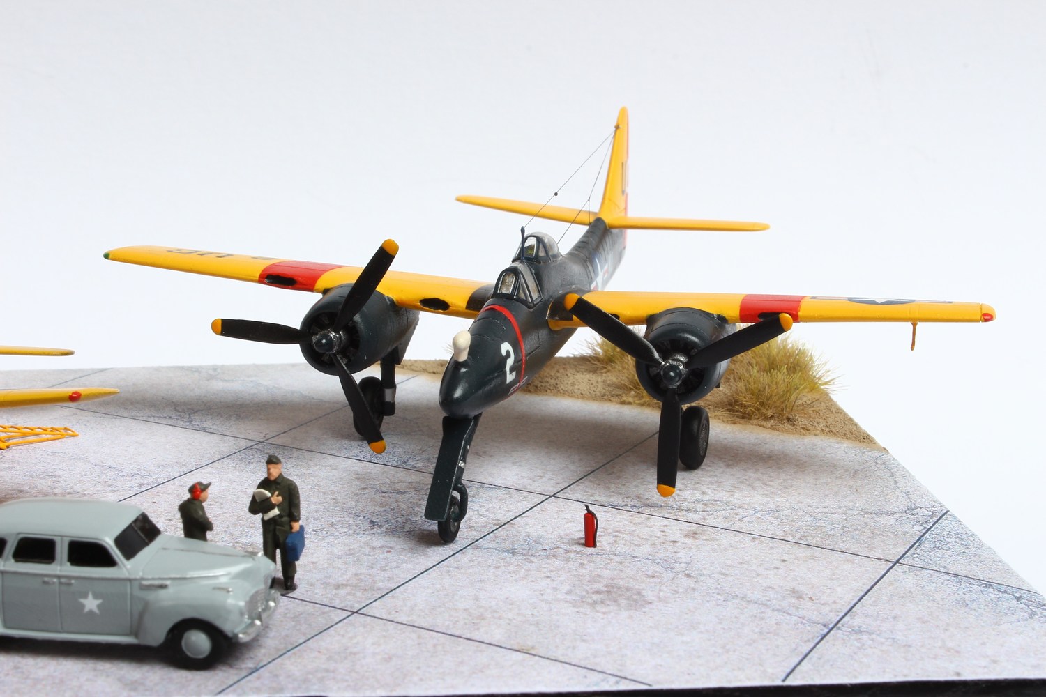 Der „glossy sea blue“-Anstrich der frühen US Navy-Jahre, besonders zu Zeiten des Korea-Krieges, wurde für die Drohnenleitflugzeuge mit einem auffälligen gelb-roten Anstrich ergänzt. Das sieht man nicht alle Tage! Und erst recht nicht bei einer Tigercat! In der -2D-Version musste „nur“ noch das hintere Cockpit nebst Haube der F8F Bearcat ergänzt werden. Jedoch: Die Tigercat besteht aus vollmassiv gegossenem Resin und trägt ein Bugfahrwerk! Tailsitter vorprogrammiert! All meine Bemühungen, Gewicht hinter der Mittelachse im Rumpf mittels Fräser herauszunehmen, quasi hohl zu machen, bei gleicher Methode den vorderen Rumpfbereich und sogar die Motorzellen mit winzigen „Liquid Gravity“-Bleikügelchen zu füllen, schlugen fehl! Stand die Maschinen vor der Montage des Höhenleitwerks noch wunderbar sicher auf dem Bugfahrwerk, war es nach der Montage der beiden Leitwerkflächen vorbei! Bei solch einem minimalen Gewicht! Hier hatte ich ein „déjà vu“, das gleiche passierte mir vor Jahren schon einmal bei meinem Bau der Grumman C1-A Trader. Fräsen bis der Arzt kommt, hinten leeren, vorne verbleien – und doch war’s nix! Nun gut, in diesem Fall zog dieser Umstand ein Verkleben auf der Sockelplatte nach sich. Zur Sicherheit habe ich das Vorderrad der Tigercat noch mit einem 0,3er Messingdraht gestiftet, den ich im Massivholzsockel einklebte.