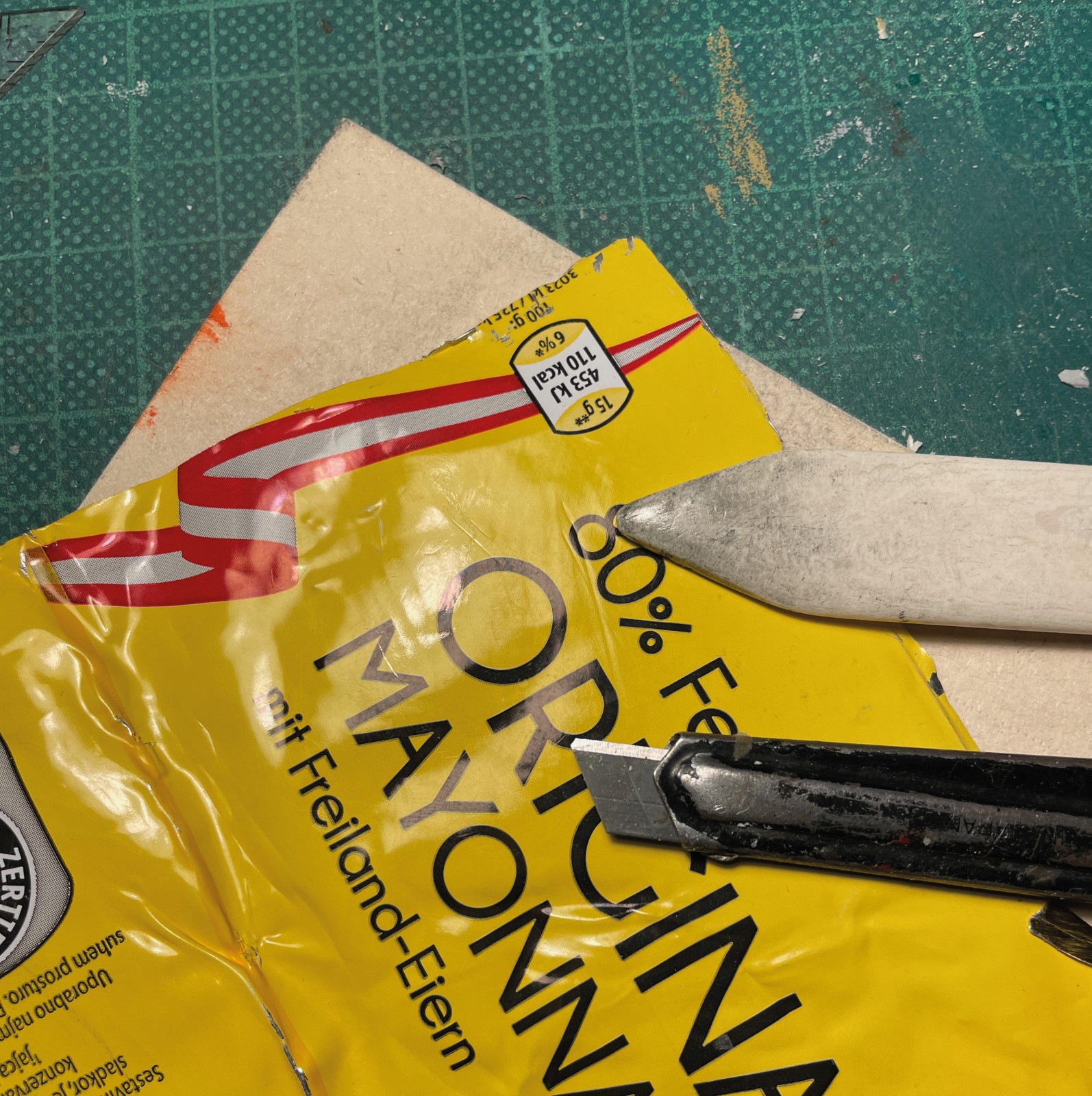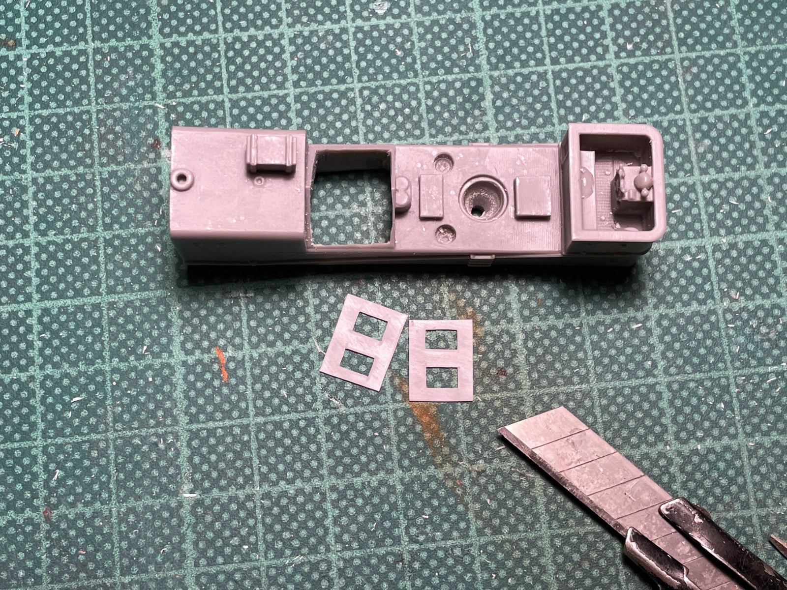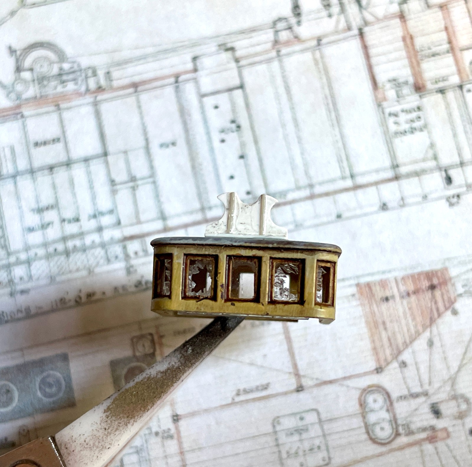 Zu den von mir gefürchteten Bauteilen zählt alles, was letzten Endes transparent sein soll. Solchen Dingen wie Cockpithauben und Fensterscheiben weiche ich, wenn möglich großräumig aus. Da war zunächst der verlockende Gedanke, die Fensteröffnung des Steuerstandes einfach leer zu lassen. Es war ja schließlich nur ein Wrack. Sehr sympathisch, weil leicht zu realisieren. Trotzdem, je länger ich darüber brütete und unzählige Stellproben betrachtete, umso weniger gefiel mir diese Idee und der innere Schweinehund begann nachzugeben. Zumindest zerbrochene Scheiben mussten es sein. Gedacht getan, schon wurde mit allerlei transparentem Material herum probiert. Das was dabei heraus kam war allerdings nicht zufriedenstellend. Der innere Schweinehund begann freudig mit dem Schwanz zu wedeln. „Lass es sein grunzte“ er aus seinem Eck. Dann, quasi ein letzter Versuch, probierte ich ein Stückerl aus einer spröden Blisterverpackung und es funktionierte. Mit dem Skalpell traktiert zerbrach das Material in verblüffend realistischer Weise. Ich bin immer wieder überrascht, welche Aufmerksamkeit dieses kleine Detail beim Betrachten auf sich zieht. Nicht auszudenken, wenn die Fensteröffnungen leer geblieben wären.