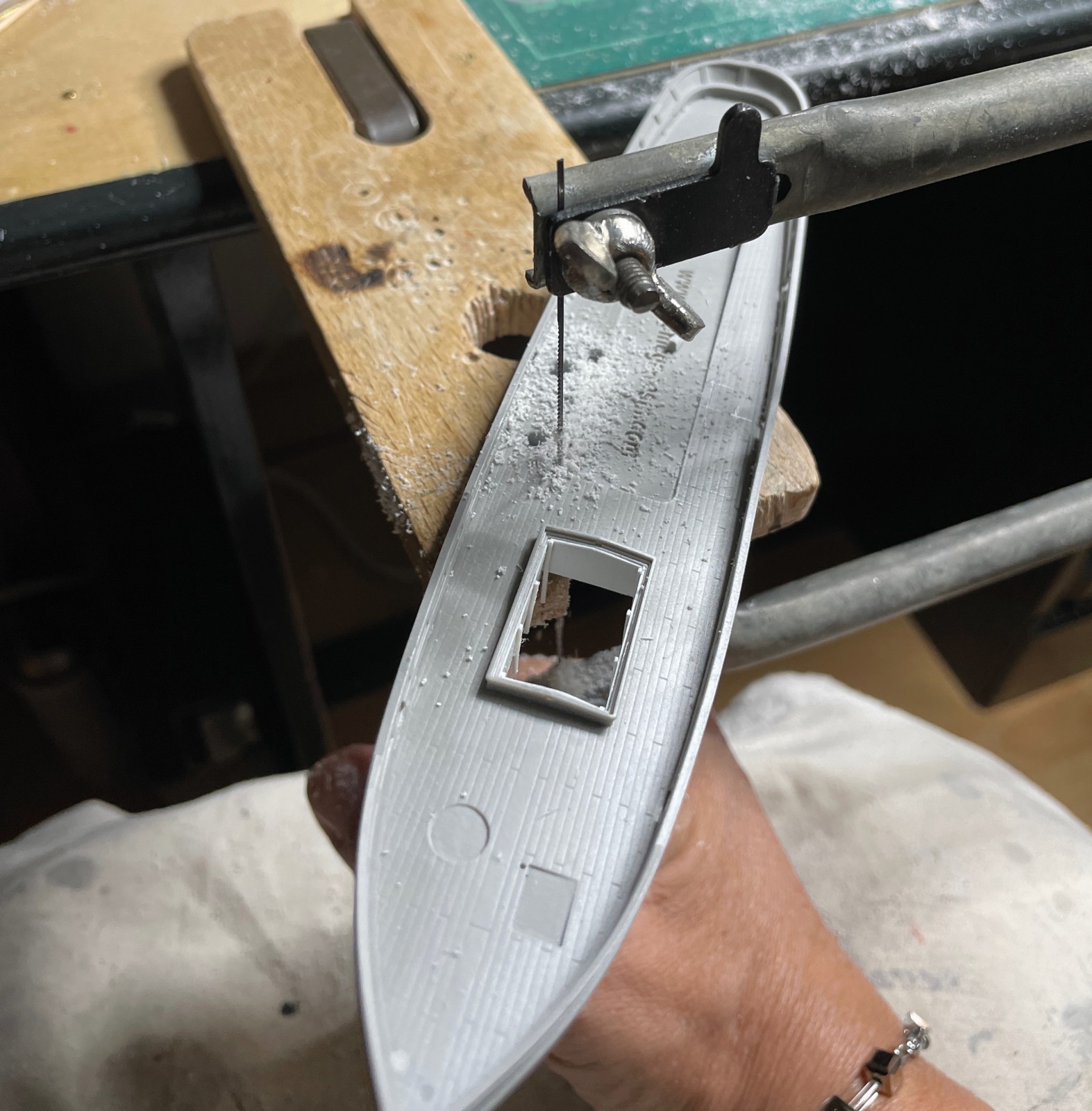 Nach dieser langen Ouvertüre ein wenig sachliches. Wie gesagt, zumeist leiten mich die Modelle und so wurde mir auch hier erst langsam klar, wo ich Einblicke gewähren wollte und zunächst, die später sichtbaren Hohlräume geschaffen werden mussten. Den Maschinenraum hatte ich schon erwähnt, doch auch die Kajütentür sollte offen stehen, der Laderaum für den Fischfang war auch klar, so wie der Abgang in den Bugbereich.