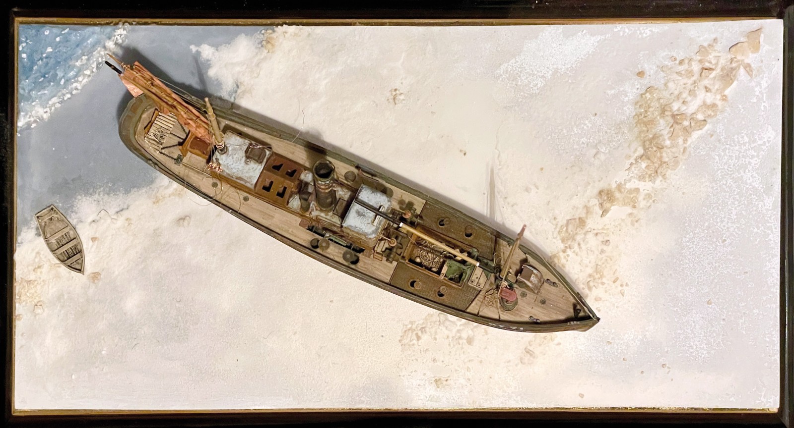 Noch nie habe ich an einem verhältnismässig einfachen Diorama so lange gearbeitet. Die ersten Versuche waren alle nicht zufriedenstellend, zu flach zu langweilig zu groß. Begabtere Menschen als ich tun sich da vielleicht leichter die richtige Komposition zu finden. Irgendwann war es dann klar, dass das Heck noch ein wenig ins Wasser ragte, gefroren natürlich und der erst des Schiffes kam leicht geneigt auf einer leichten Bodenwelle zum liegen. Kaum war der Gedanke gefasst türmten sich Probleme auf wie stellt man Eis und Schnee dar.