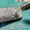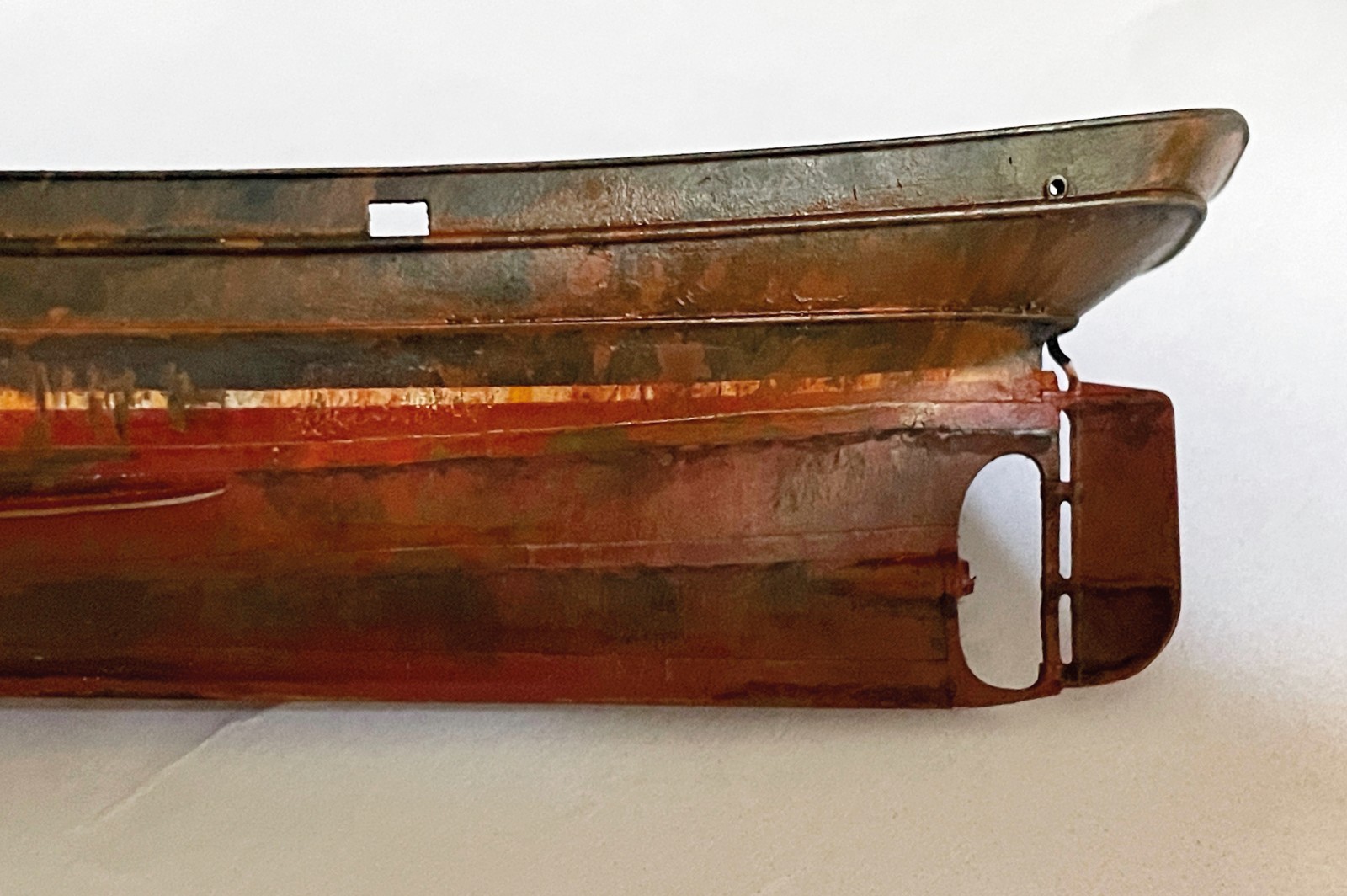 Nachdem der Rumpf ausgiebig mit diversen Lagen an Grundtönen den Chipping Fluids und letztendlich dem fertigen Anstrich versehen war, begann der Prozess des Verrosten und Verrottens. Nun habe ich ja durchaus ein bisserl Erfahrung mit dem Altern von Schiffen, verließen doch schon so manche meine kleine Werft. Das hier war jedoch eine gänzlich neue Herausforderung. Ein richtiges Wrack musste gehörig deftigere Spuren aufweisen, als ein noch in Gebrauch stehendes Schiff. Zu bedenken gilt es immer in welche Richtung das am Rumpf herablaufende Wasser nimmt, wo es länger stehen bleibt und somit Rost entsteht, wo Farbe abgeschabt wurde oder abgeplatzt ist oder wo sich schlichtweg flächiger Rost ansetzt und dann durch herablaufendes Regenwasser wieder abgespült wird.