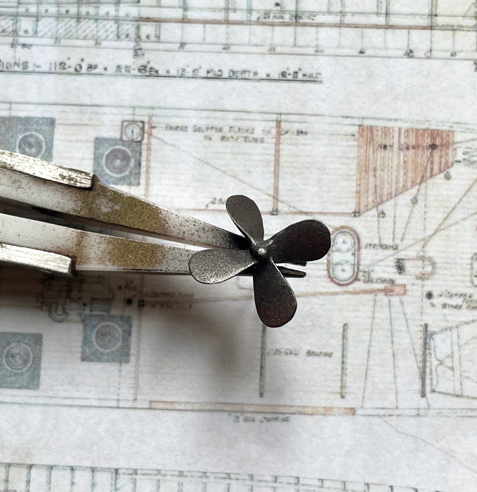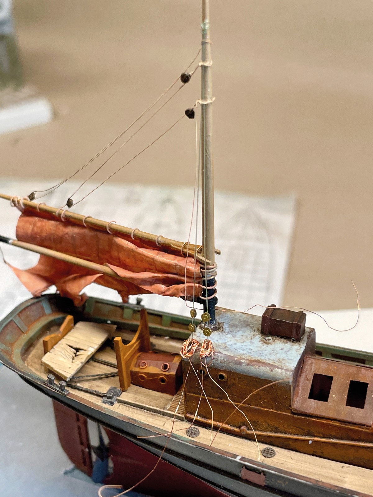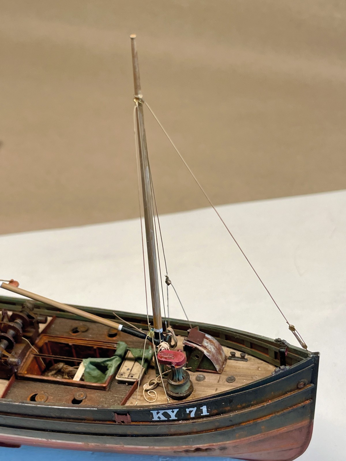 Jetzt, beim Schreiben dieses Artikels, quält mich, wie so oft die Erkenntnis, dass ich viel zu wenige Fotos gemacht habe. Fotos von Baustufen, die so manches, was nun mühsam in Texte verpackt werden muss, selbstredend verdeutlichen würden. Leider bin ich halt eine begeisterte Modellbauerin aber eine lausige Journalistin. Wenn mich die Begeisterung erfasst und es bei der Arbeit so richtig läuft, denke ich an alles andere als die fotografische Dokumentation. Da bin ich zeitweise so im „Flow“, dass alles was rund um mich herum geschieht sich der Wahrnehmung entzieht. Diese Welt der Miniaturen hat schon etwas magisches und sie zieht mich immer wieder völlig in ihren Bann. Es ist treibt mich an den Rand der Verzweiflung, wenn etwas nicht und nicht gelingen mag und sich all meine Energie an irgend einem widerspenstigen Detail verschleißt. Manchmal ist da ein tagelanges, ja sogar wochenlanges Grübeln um die Lösung eines Problems zu finden. Doch wenn es dann aus unerfindlich Gründen, allen Widerständen zum Trotz gelingt, kehrt eine tiefe Freude und Zufriedenheit ein. Gerade jetzt, in diesen Zeiten wo die Welt aus den Fugen zu geraten scheint, bin ich dankbar für meinen Fluchtort. Oft, vielleicht zu oft, ziehe mich zurück und flüchte in meine Fantasie, die sich unter der Lupenlampe zu einer kleinen Realität entwickelt. Diese Miniatur dieses kleinen Fischkutters war eine ziemliche Herausforderung und große Freude in einem. Zahlreiche neue Techniken wurden erprobt, die manchmal zu guten Ergebnissen führten, mich manchmal, reumütig zu altbewährten Techniken zurückkehren ließen.