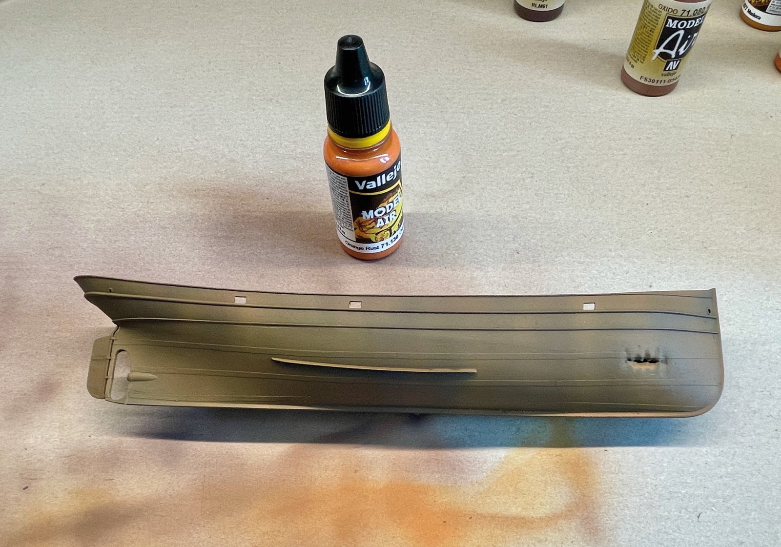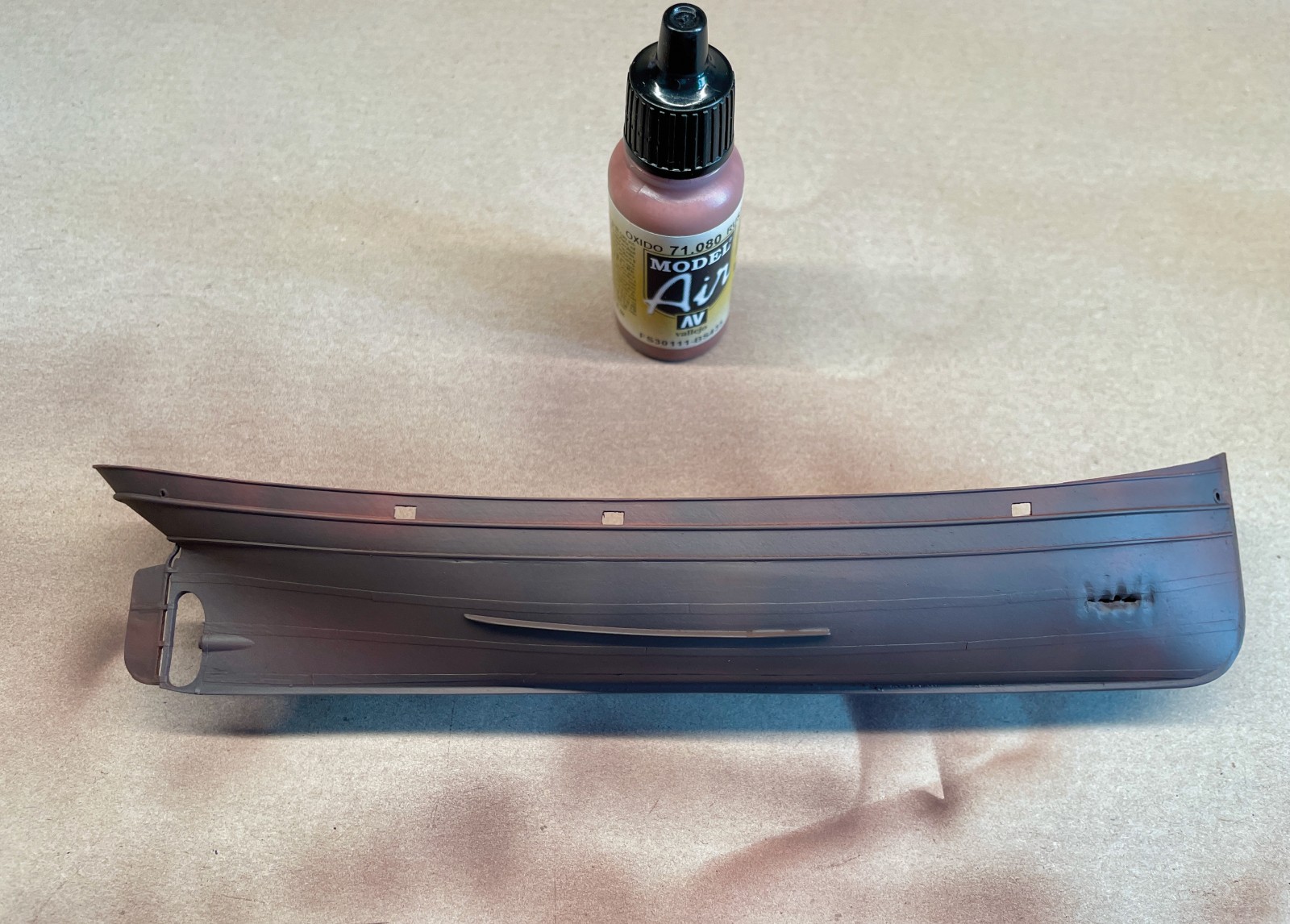 Ein kleines, eigenes Modell stellte der Abgang in den vorderen Bugbereich dar. Er sollte fragil und zerbrechlich wirken, die Türen offen und teilweise aus den Angeln gerissen. Anfänglich war da eine Enttäuschung, als sich das sehr dünne Plastik durch den Klebstoff zu verformen begann. Irgendwie brauchte ich Abstand nach der scheinbar vergeblichen Mühe und ließ es liegen. Lackierte es dann irgendwann, den Rest einer Farbe versprühend und es fing mir an zu gefallen. Was anfänglich ziemlich verhunzt - darum keine Fotos - ausgesehen hat trat nun, überraschend realistisch nach Blech aussehend in Erscheinung und ich arbeitete geduldig weiter Schicht um Schicht.